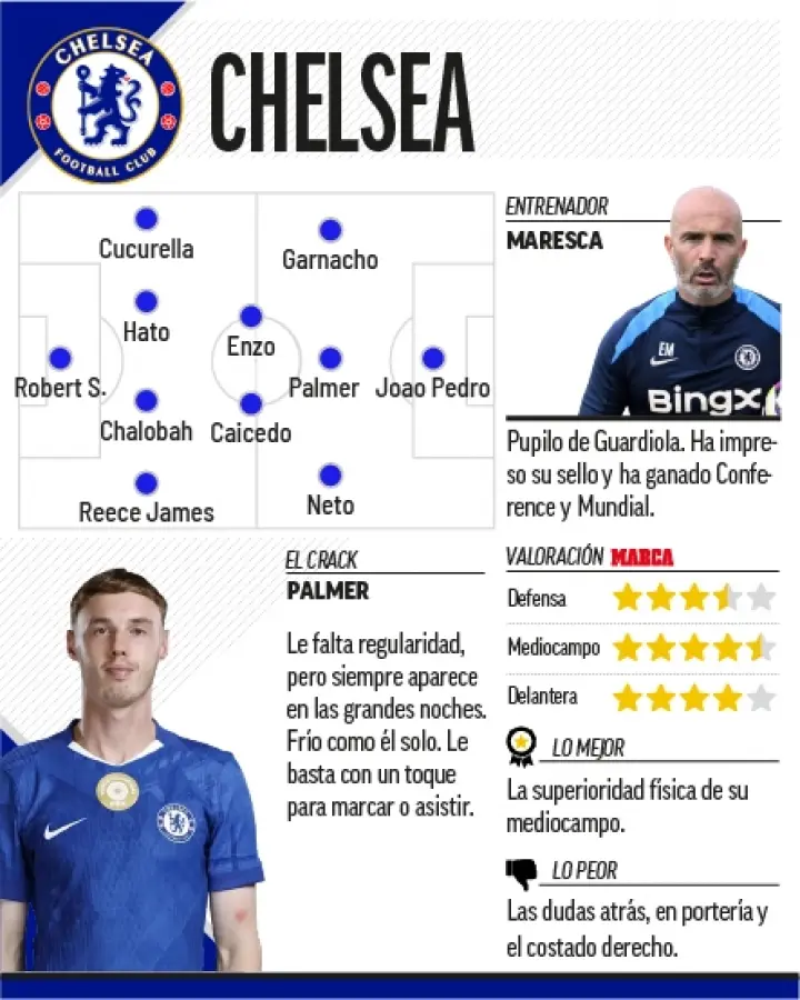 Они вернулись в Лигу чемпионов после двухлетнего перерыва. Наконец, после более чем 50 приобретений и 1,7 миллиарда евро, вложенных с момента прихода Бёли, они начинают выглядеть как топ-команда. Они выиграли Лигу Конференцию, но их разгром «ПСЖ» (3:0) и победа на Клубном чемпионате мира останутся в памяти. У «Челси» есть проблемы в обороне, но дуэт Кайседо-Энцо Фернандес даёт им физическую мощь, с которой мало кто может сравниться. К забегов Палмера и Кукурельи стоит добавить универсальность их нападающих: Жоау Педро, Эстевао, Нету... Возможно, им не хватает проверенного бомбардира.