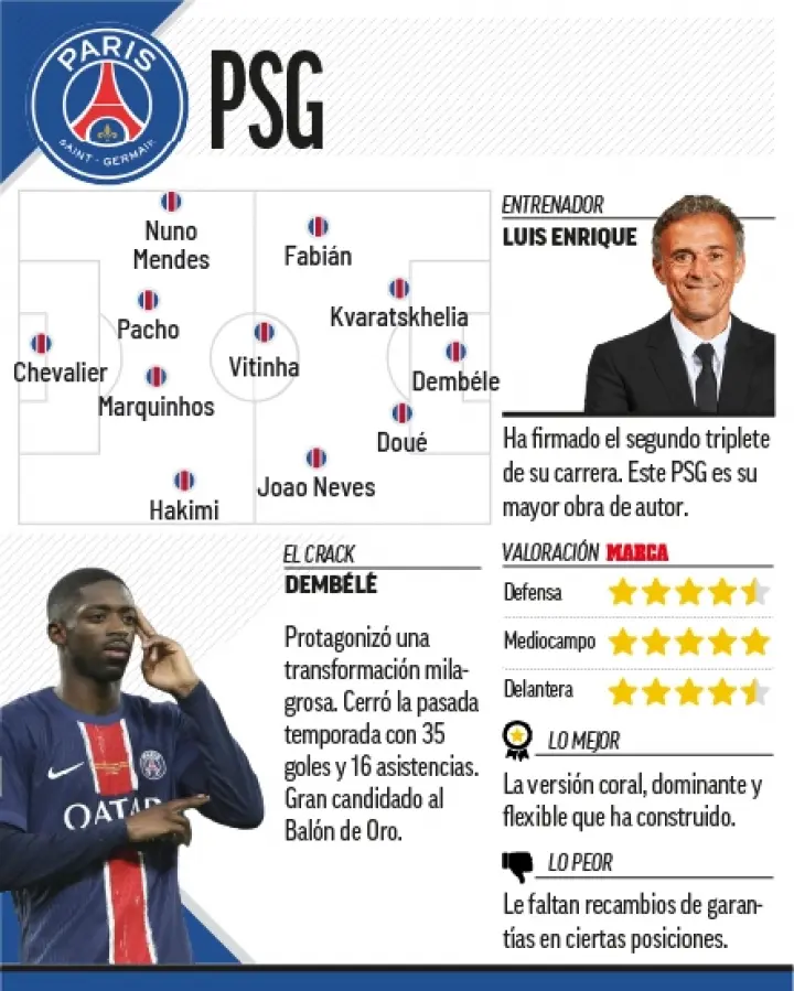 Чемпионы начинают как явные фавориты. В прошлом сезоне впервые в своей истории выиграли Лигу чемпионов. Луис Энрике создал идеальную «машину», которая претерпела лишь одно радикальное изменение: Доннарумма передал вратарские обязанности Шевалье. Он также усилил оборону Забарни. В любом случае, главным преимуществом «ПСЖ» снова станет их стиль игры. Луис Энрике построил великолепную команду, которая невероятно динамичная и гибкая, и Дембеле — это яркий пример их игры.