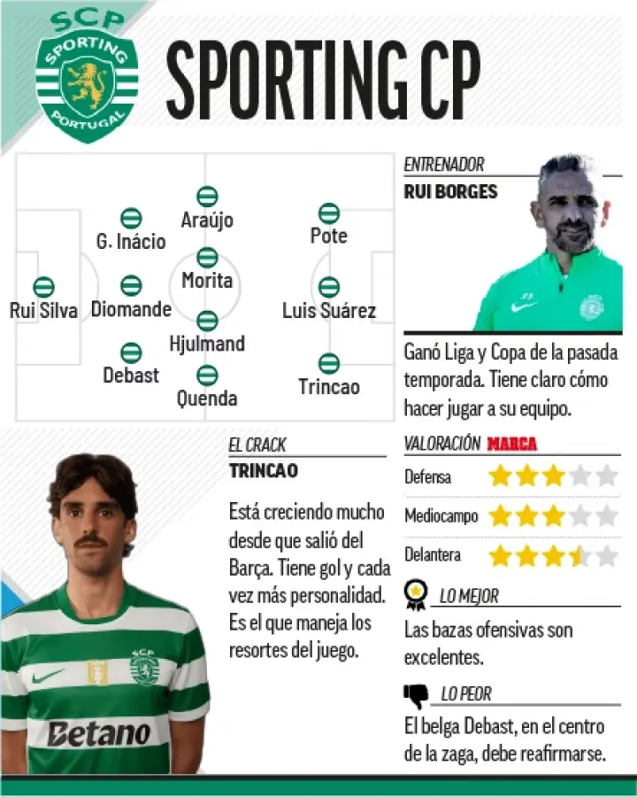 Чемпионам двух последних лет будет непросто добиться требла, учитывая появление нового «Порту». Но хорошая новость заключается в том, что «львы» сохранили свой костяк, несмотря на продажу Дьёкереша «Арсеналу» более чем за 65 миллионов. Костяк команды остался прежним: Инасиу, Тринкау и Педру Гонсалвеш. Кроме того, клуб приобрел колумбийца Луиса Суареса из «Альмерии» по относительно низкой цене (22 миллиона евро) может забить не меньше голов чем Дьёкереш. Это хорошая команда, которая продолжает философию Руя Борхеса.