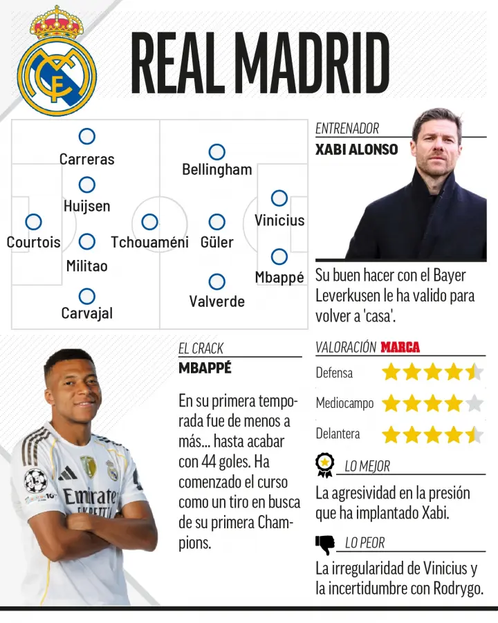 Приход Хаби Алонсо знаменует собой «смену цикла». Его влияние уже заметно, как и активная игра Каррераса на левом фланге и скачок уровня атаки команды благодаря передачам Хейсена. Тренту предстоит конкурировать с Карвахалем, а Мастантуоно ищет место для игры, ожидая возвращения Беллингема. Стоит отметить прогресс Тчуамени и Арды Гюлера, который взял под контроль полузащиту. Мбаппе закрепил за собой статус лидера благодаря голам, а Винисиус продолжает бороться за возвращение своей формы и внимательно смотрит на то как Хаби Алонсо объясняет ему как правильно нужно отдавать пас.
