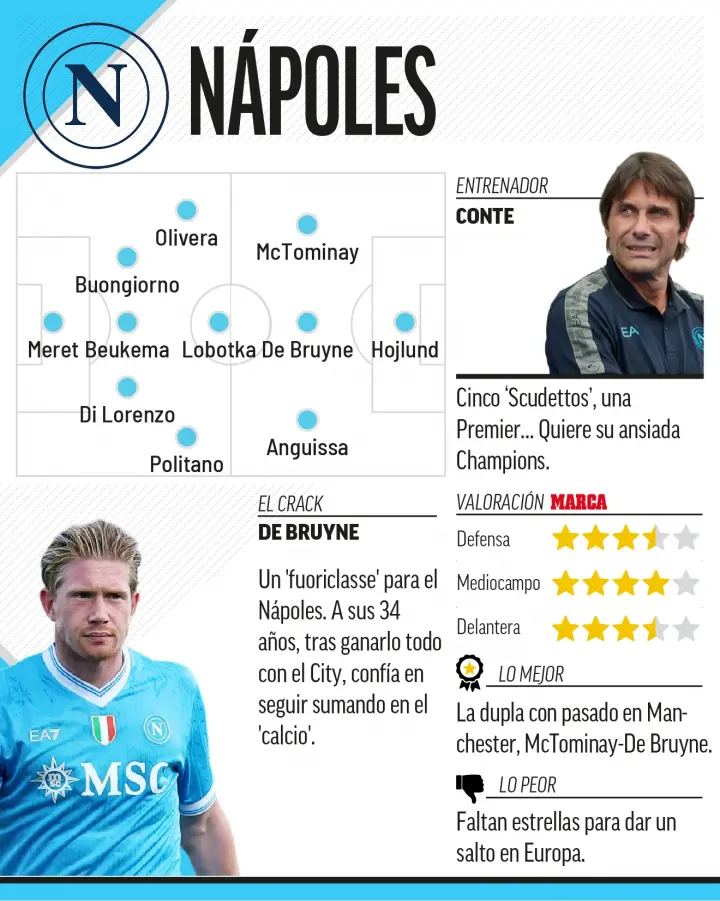 Несмотря ни на что, Антонио Конте остаётся ещё на год в лучшей команде «Наполи» со времён Марадоны. В его полузащите появится самый громкий игрок со времён гения аргентинского футбола Кевин Де Брюйне. Легенда «Сити» присоединяется к чемпионам Серии А, которые выиграли два из трёх последних «Скудетто». Доказав свою силу в лиге, полной претендентов, «Наполи» хочет доказать свою состоятельность с новыми лицами, такими как Мигель Гутьеррес, Ойлунд, Ноа Ланг... и наконец-то засиять в Лиге Чемпионов.