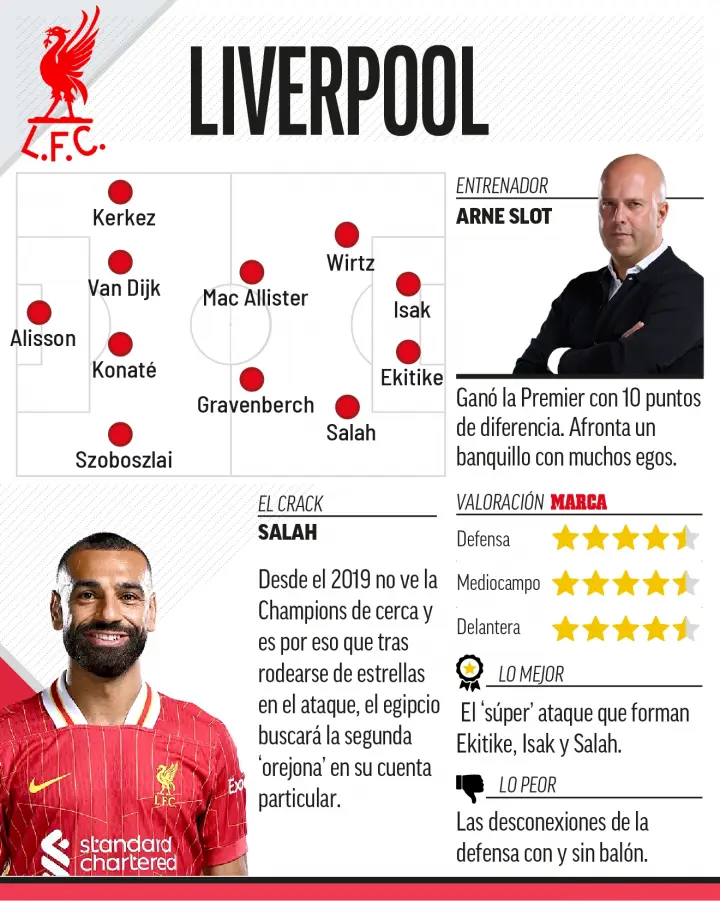 То как «Ливерпуль» провел трансферную компанию делает их одним из главных претендентов на победу в Лиге чемпионов. «Красные» потратили 482 миллиона евро на усиление команды, которая и так была нацелена на многое, но теперь, с такими игроками, как Исак, Экитике и Вирц, они надеются привезти трофей на «Энфилд». Прошлый сезон был для них первым сезоном под руководством Арне Слота, после того как Клопп привёл «Ливерпуль» к победе. Однако, несмотря на лёгкую победу в Премьер-лиге над «Арсеналом», «Ливерпулю» «не повезло» в 1/8 финала против «ПСЖ», как заявил главный тренер после трагической серии пенальти для его команды.