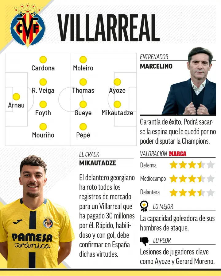 «Вильярреал» возвращается в Лигу Чемпионов четыре года спустя, оставив незабываемые воспоминания о полуфинале против «Ливерпуля» под руководством Унаи Эмери. Теперь, под руководством Марселино. Клуб понимает, что жеребьёвка сведёт их с командами топ-уровня, поэтому выход в плей-офф, цель, которую они перед собой поставили, будет нелёгкой. Мощная оборона и классные атакующие игроки Айозе и Микаутадзе — их главные козыри.