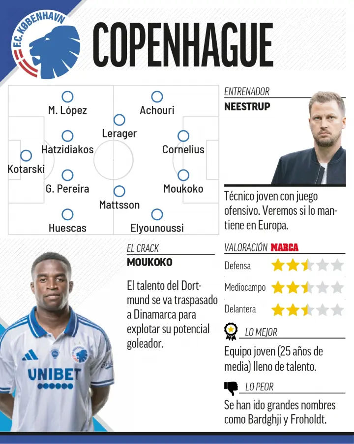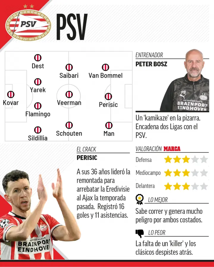 Этим летом в Эйндховене произошла настоящая революция. Чемпионы Эредивизи воспользовались уходом Де Йонга (Лука), Тиллмана, Ланга, Бакайоко и Боскальи, чтобы омолодить состав важными приобретениями: Яреком, Ван Боммелем, Ваннером, Силдиллией... Однако костяк команды сохранился (Дест, Фламинго, Схоутен, Верман, Тил...), и Перишич продолжает вносить свой вклад. Однако команде не хватает игрока номер 9 с определённой стабильностью в нападении: это станет задачей Плеа, Пепи и Боаду. Они создают много опасности на флангах (Дест сейчас в отличной форме) и при стандартных положениях.