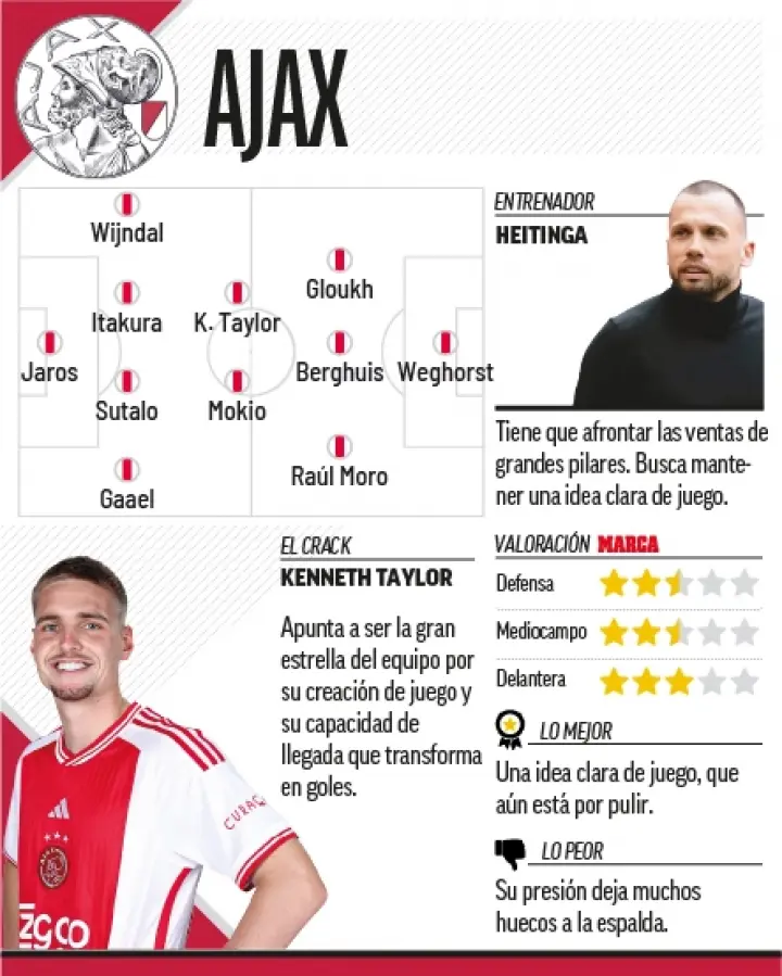 Они возвращаются в Лигу чемпионов с обновлённой надеждой после того, как в прошлом сезоне заняли второе место в Эредивизи и проиграли в 1/8 финала Лиги Европы. Под руководством Джона Хейтинги они делают ставку на высокий прессинг, хотя порой чрезмерный и неорганизованный, что создаёт проблемы в обороне. Продажи Йоррела Хато и Хендерсона были попытались заменить приобретениями, такими как Итакура, Оскар Глух, Дольберг и Моро, чтобы найти баланс на флангах и в глубине. Порядок, заданный англичанином, станет серьёзной проблемой, которую Амстердам постарается решить, чтобы успешно выступить в этой Лиге чемпионов.