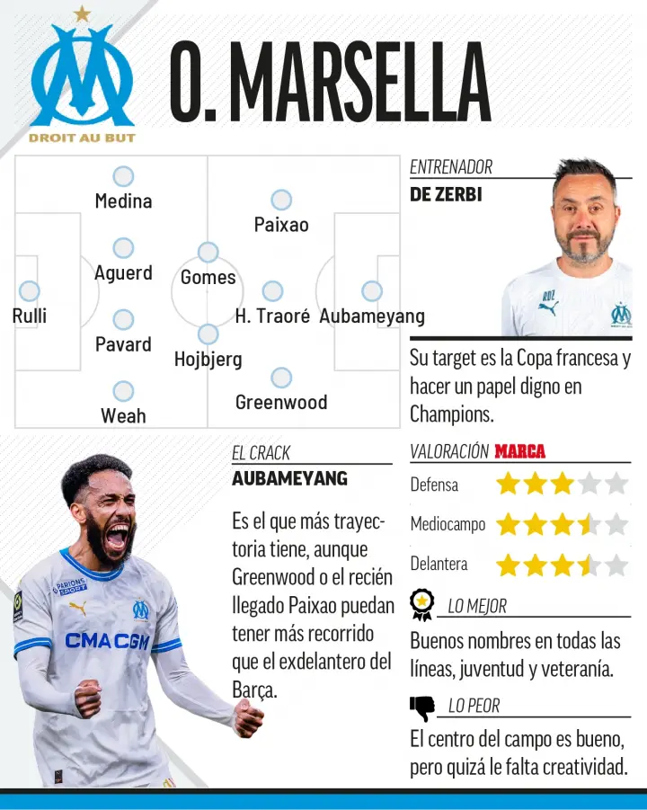 Роберто Де Зерби, как это принято в проблемном «Марселе», начал год с уже решённой проблемой Рабьо. Хотя победить «ПСЖ» практически невозможно, «Марсель» обязан блеснуть в этом сезоне, подписав, например, Обамеянга. У них есть хорошие игроки во всех линиях, хотя и не звёзды, и они без проблем займут второе место в Лиге 1 и постараются успешно сыграть в Лиги Чемпионов.