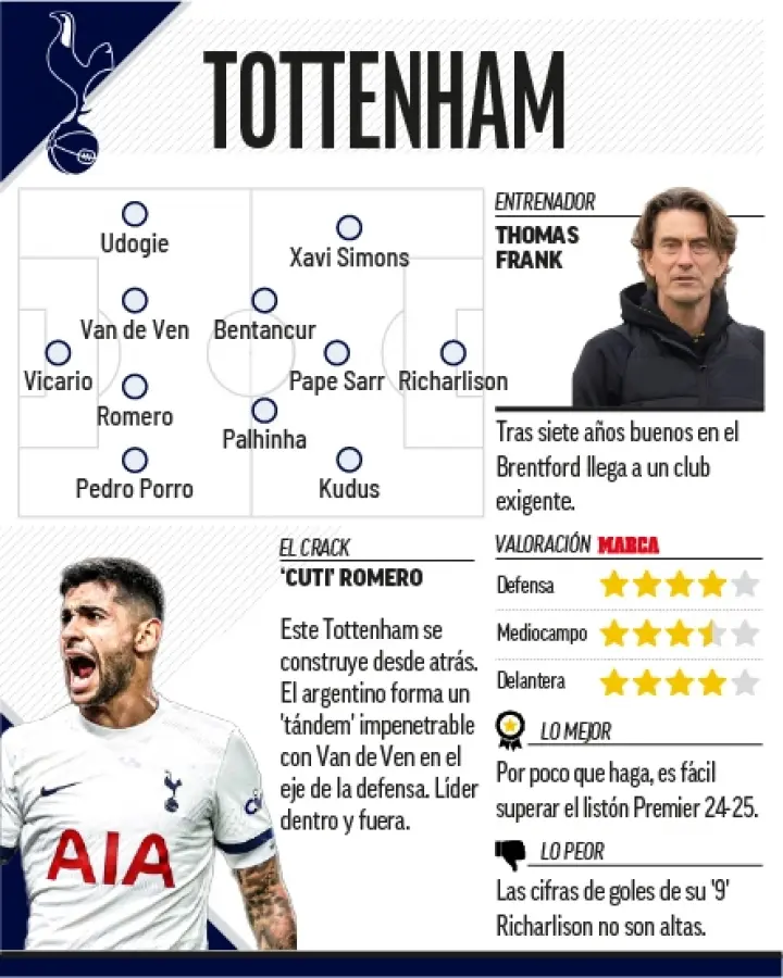 После провала прошлого сезона в Премьер-лиге (несмотря на победу в Лиге Европы) «Тоттенхэму» требовался глоток свежего воздуха. Игра Томаса Франка выглядит многообещающе, несмотря на поражение от «Борнмута» перед перерывом. Он привносит свежие идеи и, возможно, по именам у него более сильная команда, хотя уход Сона наносит удар по команде. «Тоттенхэму» удалось сохранить «Кути» Ромеро, Ван де Вена и Бентанкура. Команда будет непросто так как придется одновременно играть в Премьер-лиге и Лиге чемпионов, предъявляя высокие требования к обеим турнирам. Но эта команда вполне может прогрессировать.