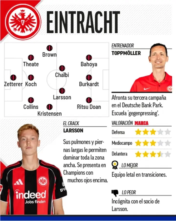 До сезона 2022/23 они даже не участвовали в турнире, а с тех пор дважды участвовали в последних четырёх розыгрышах. Та команда завоевала свой первый билет в Лигу чемпионов, став победителем Лиги Европы на стадионе «Санчес-Писхуан». Однако эта команда добилась этого, впервые с начала 1990-х годов попав в 4-ку лучших в Бундеслиге. И всё это при том, что они заработали более 400 миллионов евро. Клуб попробует достойно выступить, но должен будет это сделать без Экитике. С Ларссоном, Бахоей, Джаном Узуном и Бахоей есть материал для консолидации проекта Топпмёллера.