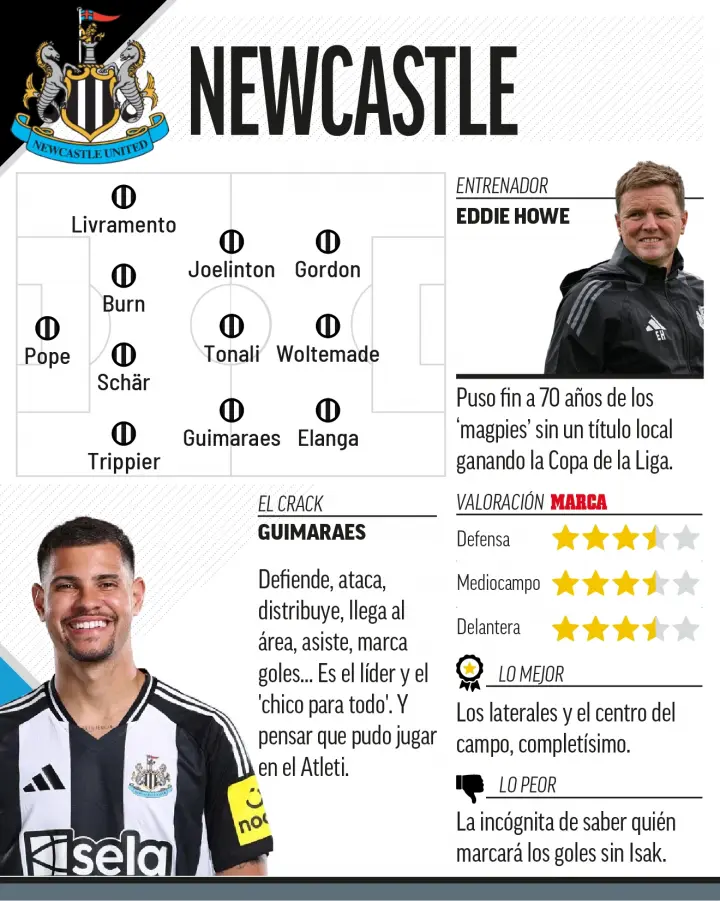 Длинное лето на «Сент-Джеймс Парк» ознаменовалось уходом Исака в «Ливерпуль» в последнюю минуту. «Ньюкасл» потратил 142 миллиона на Виссу (57) и Уолтемейда (85), но пустота, образовавшаяся после ухода бывшего игрока «Реал Сосьедада», очень велика. Приход Рамсдейла, Тиава, Рэмси и Эланги – по одному в каждой линии – ещё больше углубил состав Эдди Хау, у которого есть трио высококлассных крайних защитников (Триппьер, Ливраменто, Холл). У команды достойная полузащита в лице: Гимарайнш, Тонали и Жоэлинтон.