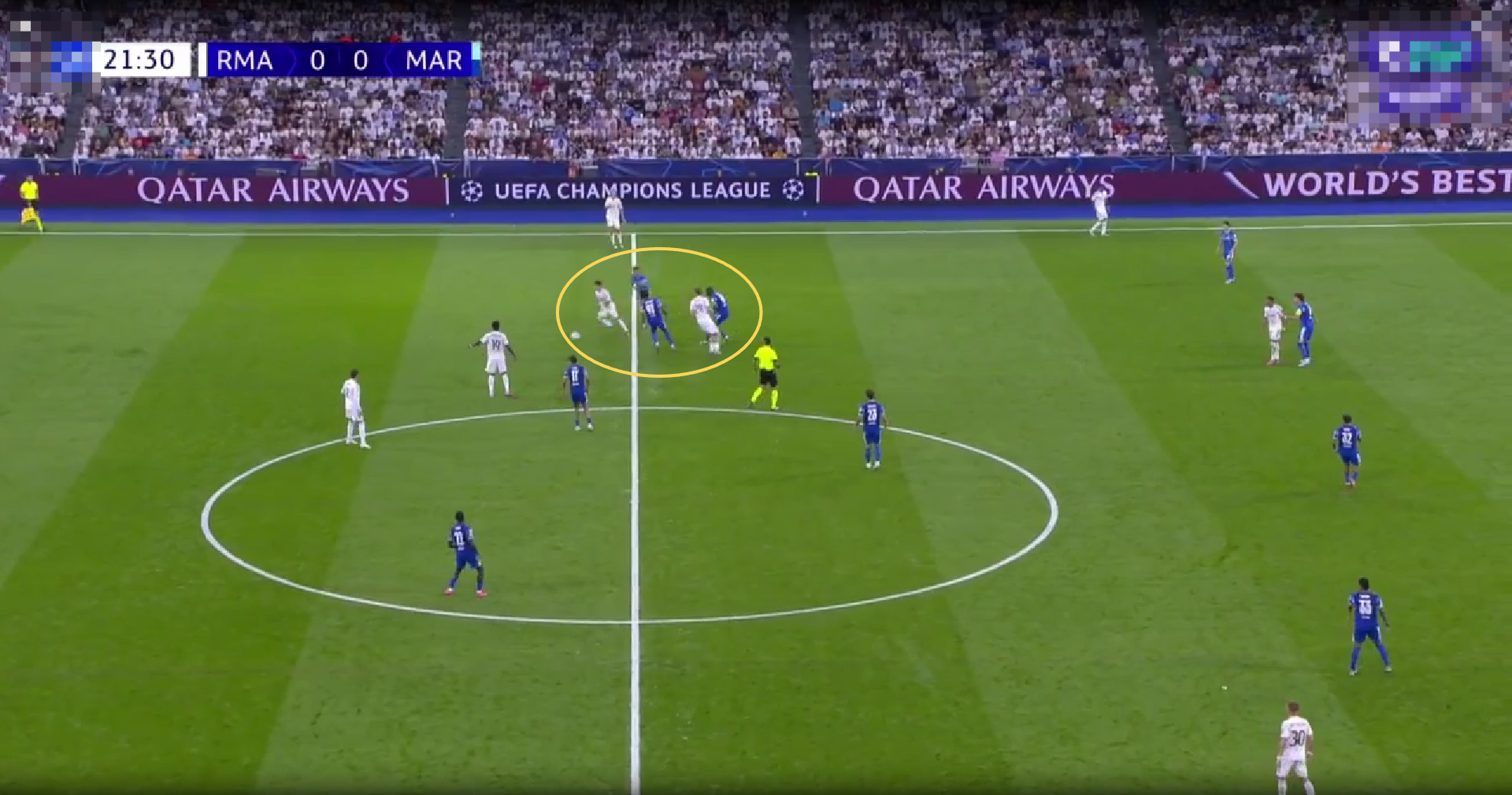 Важно, что вспышки работы без мяча случаются не эпизодически, а носят системный характер. Здесь «Мадрид» вынуждает соперника перевести мяч на фланг и зажимает его там всем составом: у «Марселя» разобраны все игроки.
