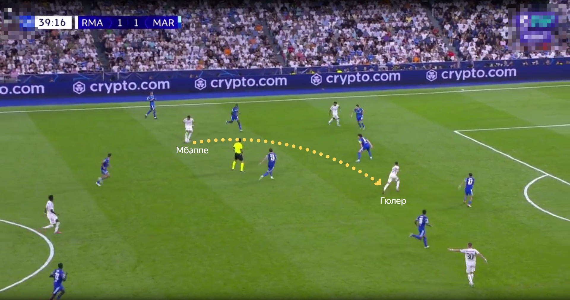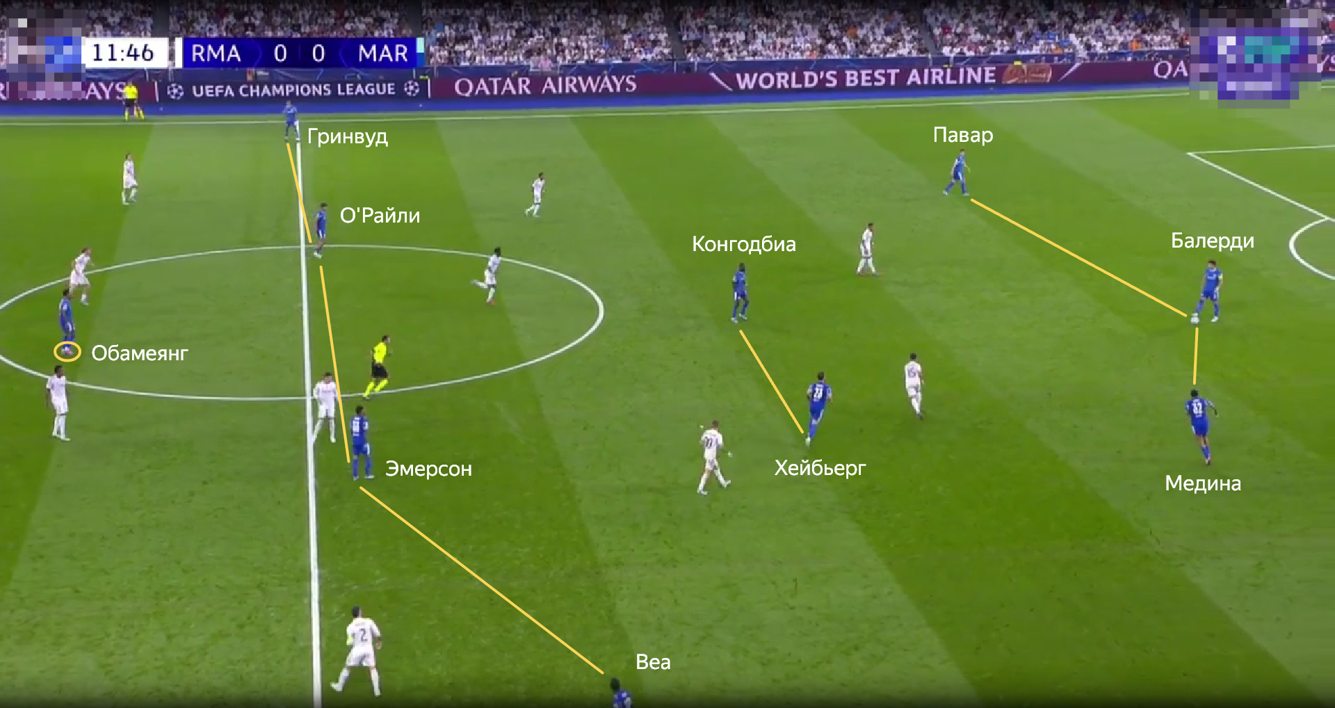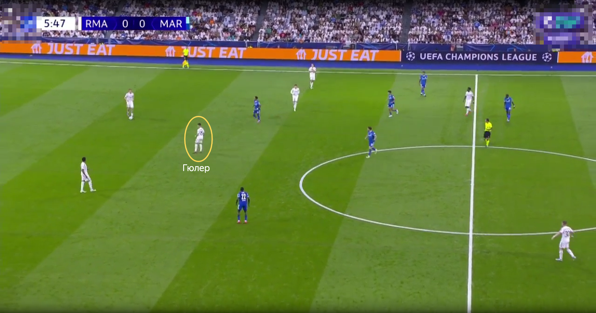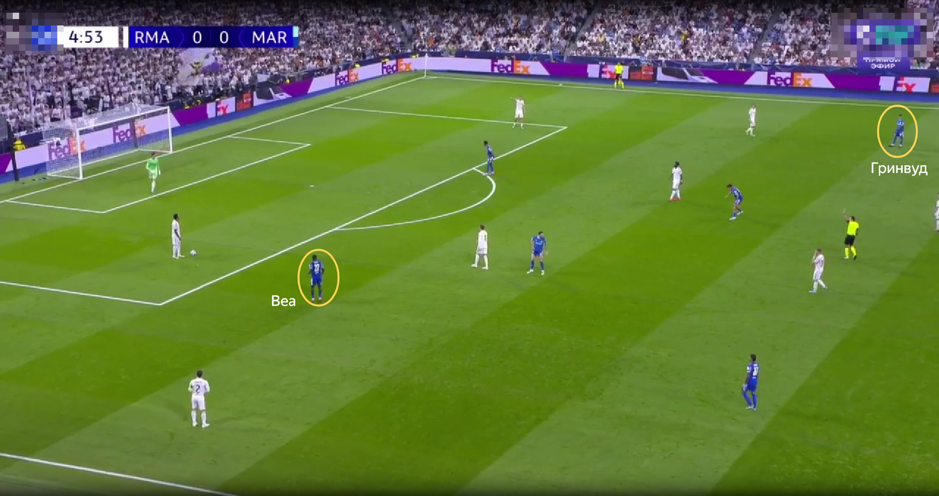 Еще одна деталь, которая отражает ставку «Реала» на левый фланг. Посмотрите на разницу в позициях вингеров «Марселя» в стадии без мяча. Гринвуд всегда находился намного глубже, что косвенно подтверждает тот факт, что большую угрозу ожидали именно на той стороне поля.