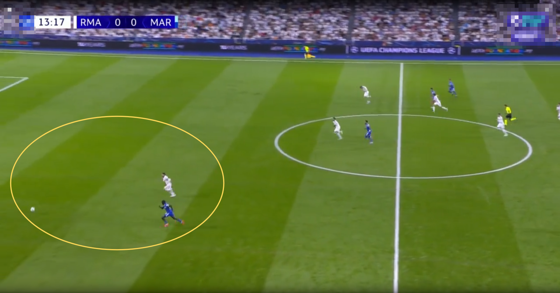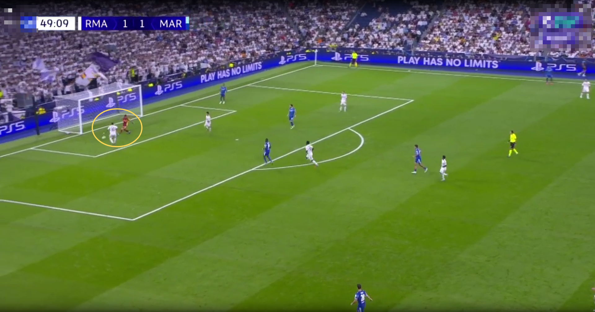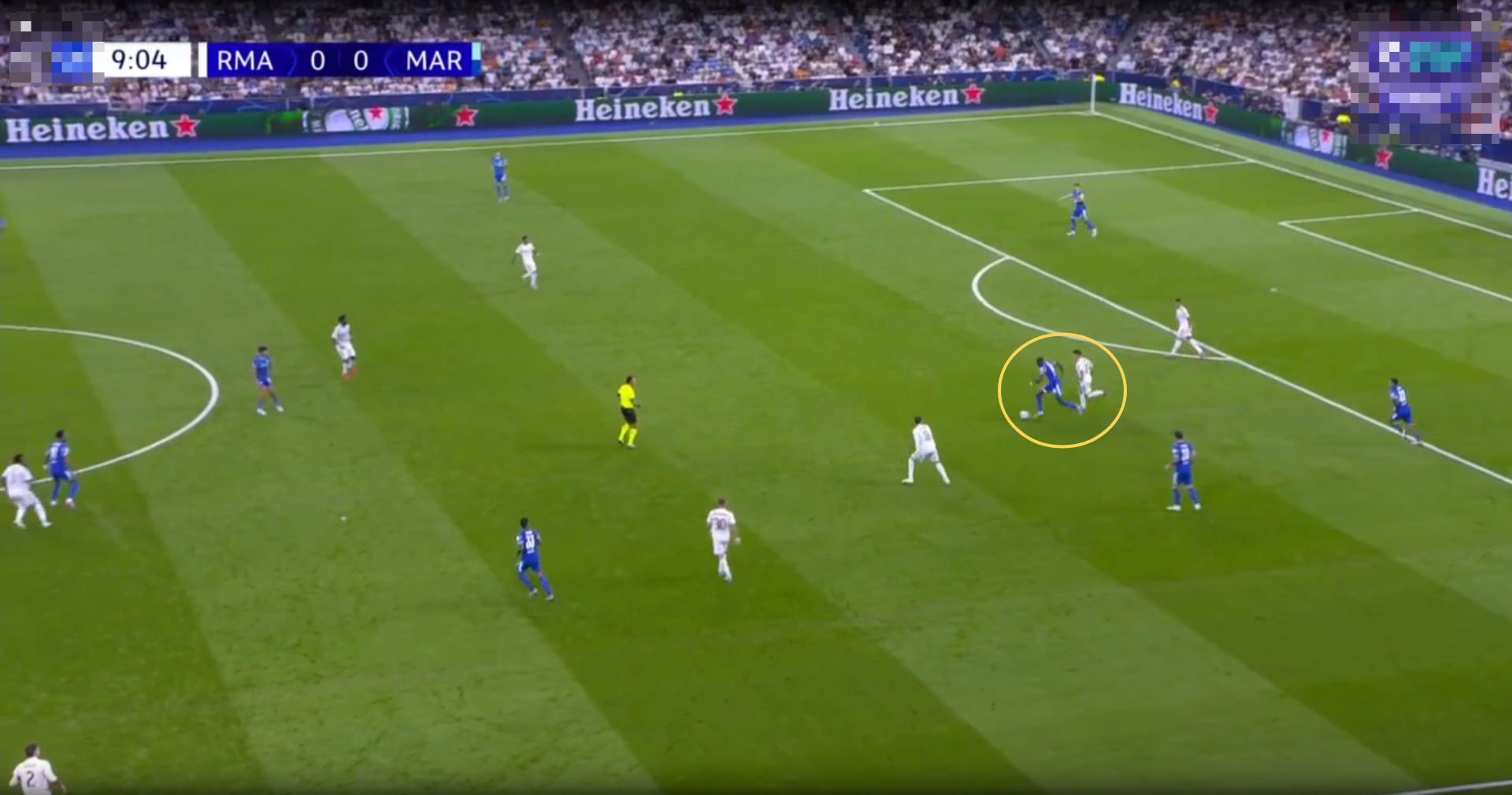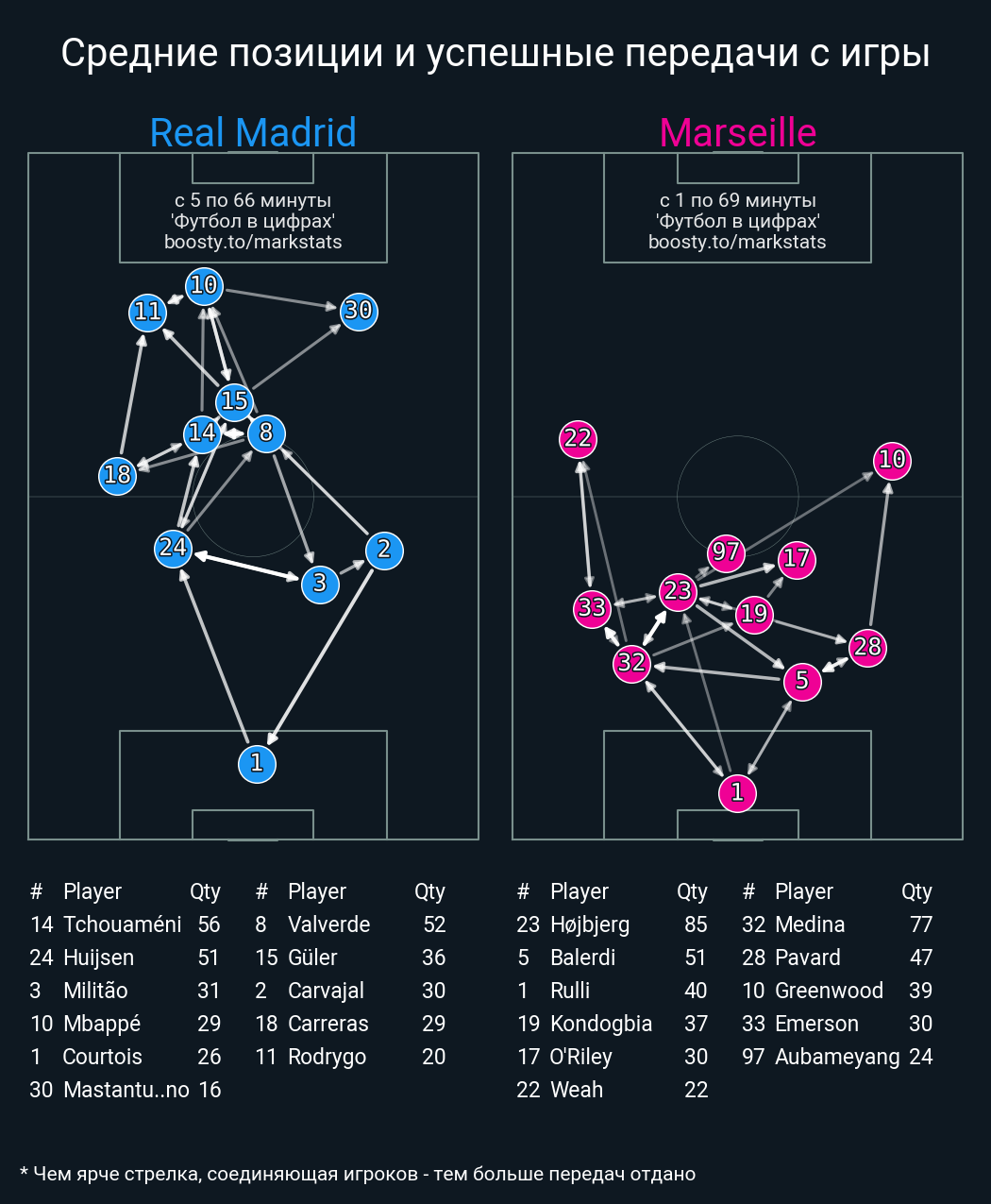 Еще одна деталь, которая отражает ставку «Реала» на левый фланг. Посмотрите на разницу в позициях вингеров «Марселя» в стадии без мяча. Гринвуд всегда находился намного глубже, что косвенно подтверждает тот факт, что большую угрозу ожидали именно на той стороне поля.