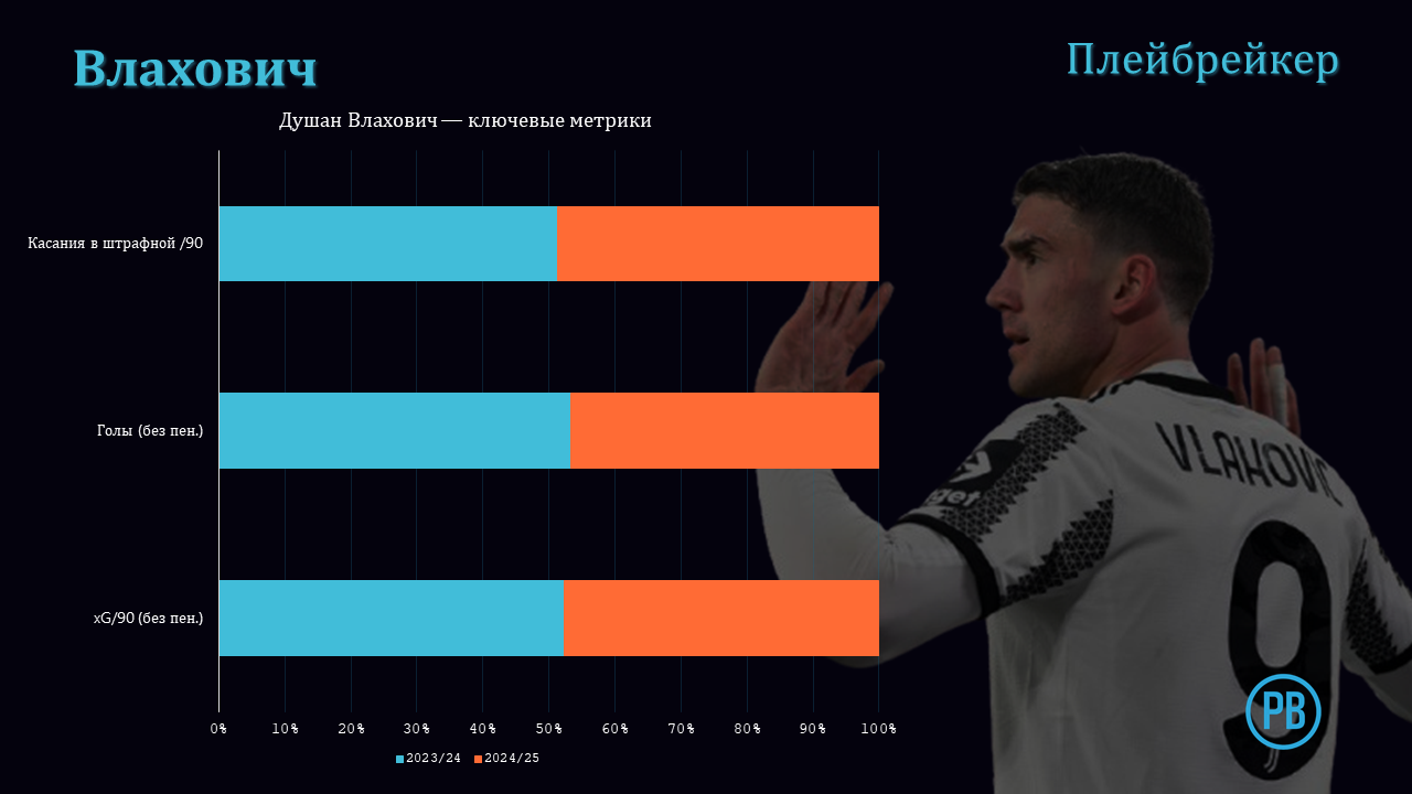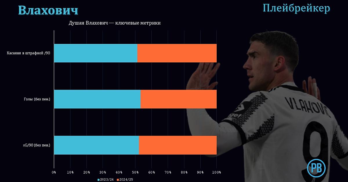 Душан Влахович остаётся редкостью в современном футболе. Когда большинство форвардов вынуждены расширять функционал - играть в подыгрыше, опускаться за мячом или уходить на фланг, - он сохраняет верность самой простой роли: забивать из центра штрафной.