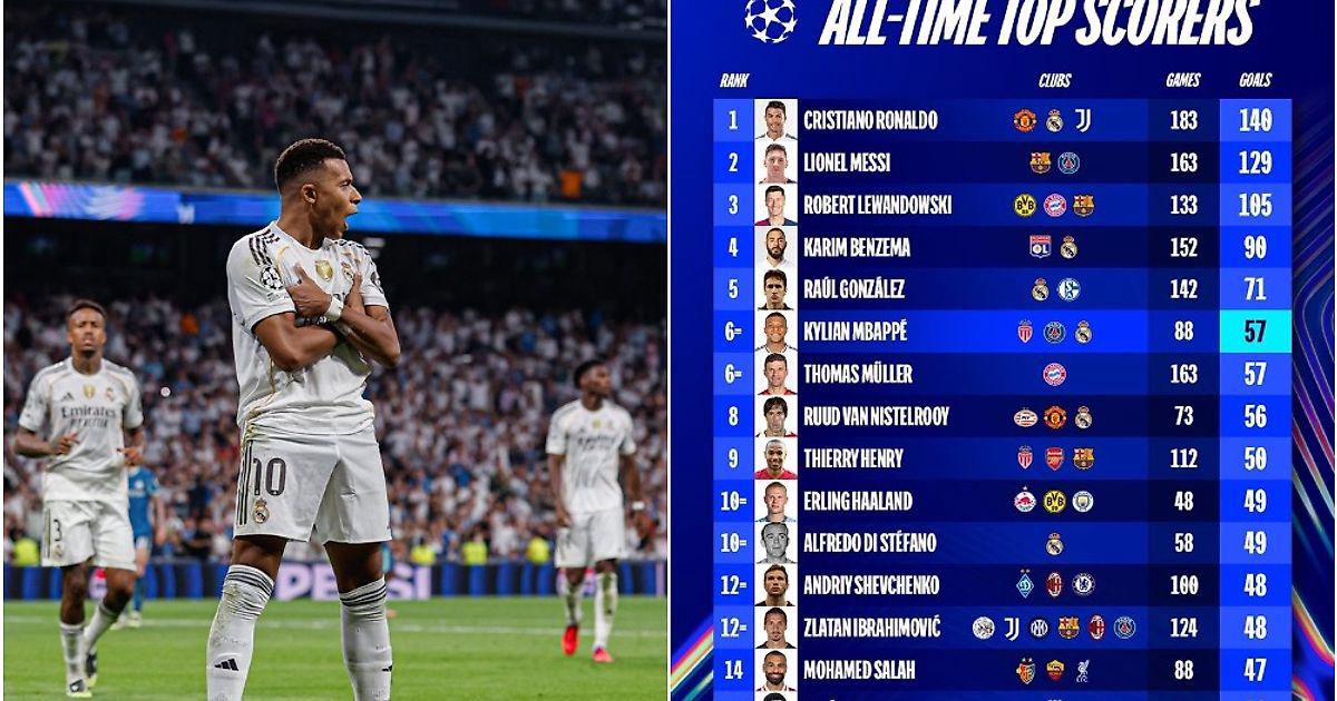 Дубль Килиана Мбаппе стал 56-м и 57-м голами француза в ЛЧ. Теперь он в топ-6 бомбардиров за всю историю турнира.