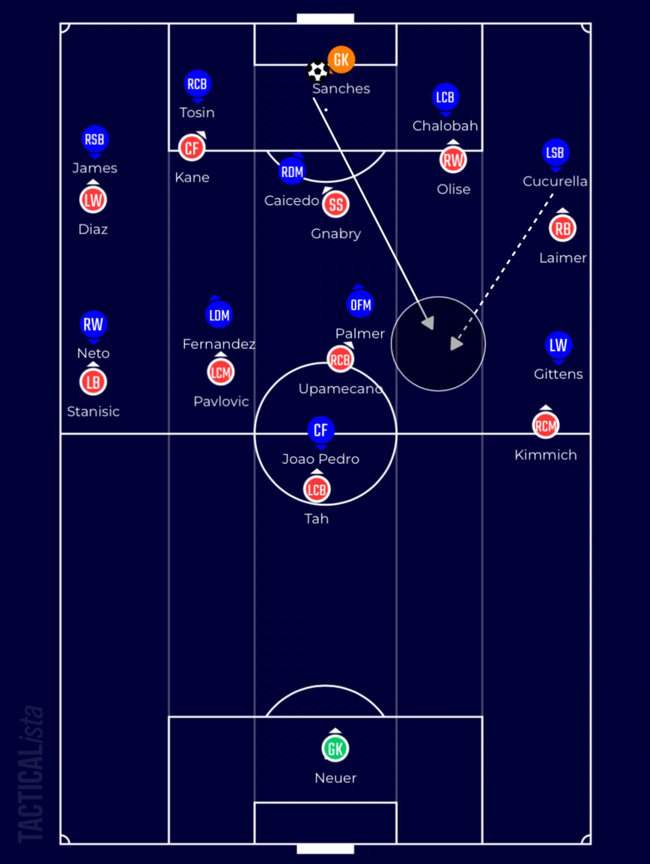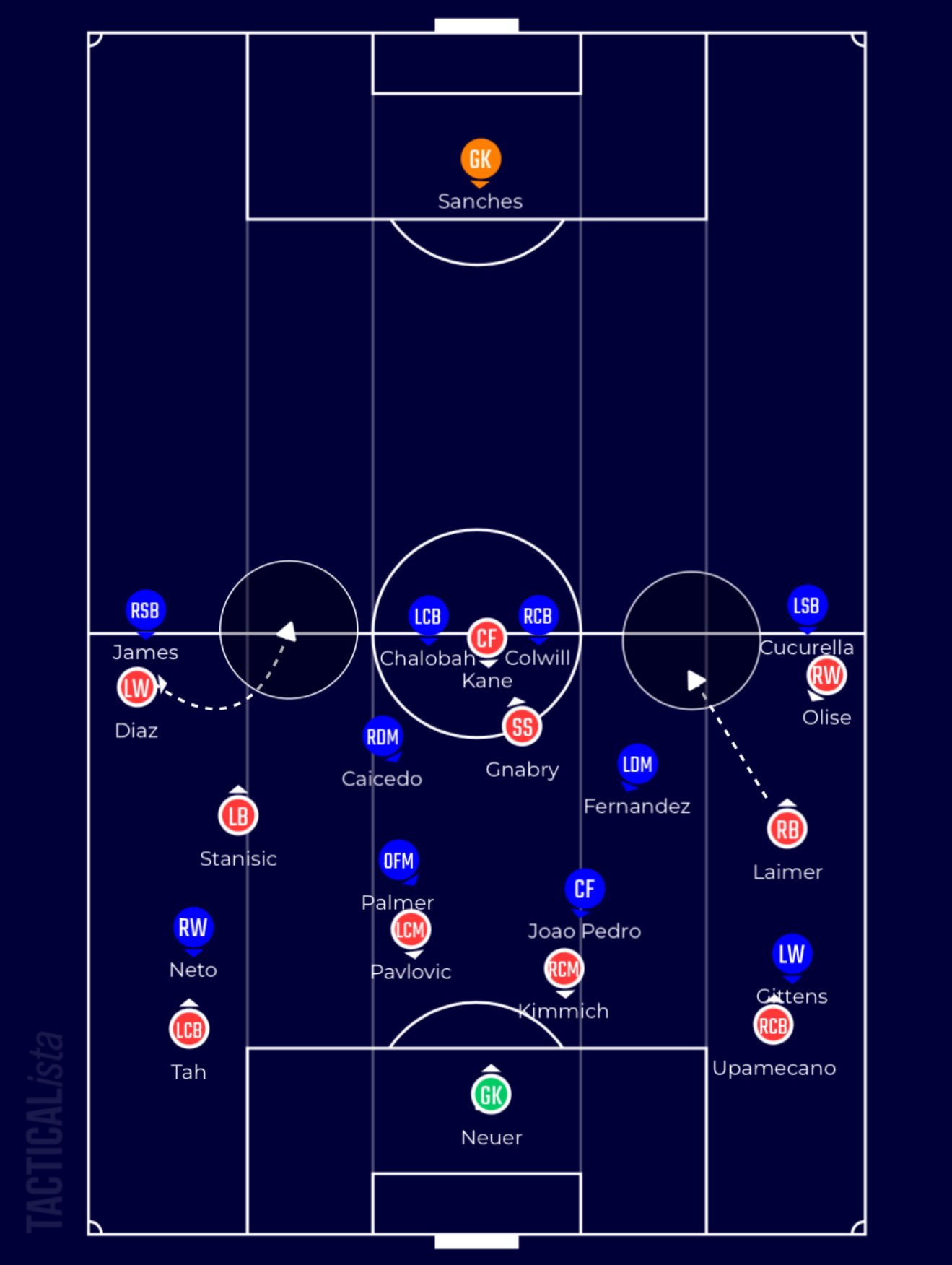 Диас слева и Лаймер справа способны разрушить прессингующую структуру «Челси» своими забегами без мяча.