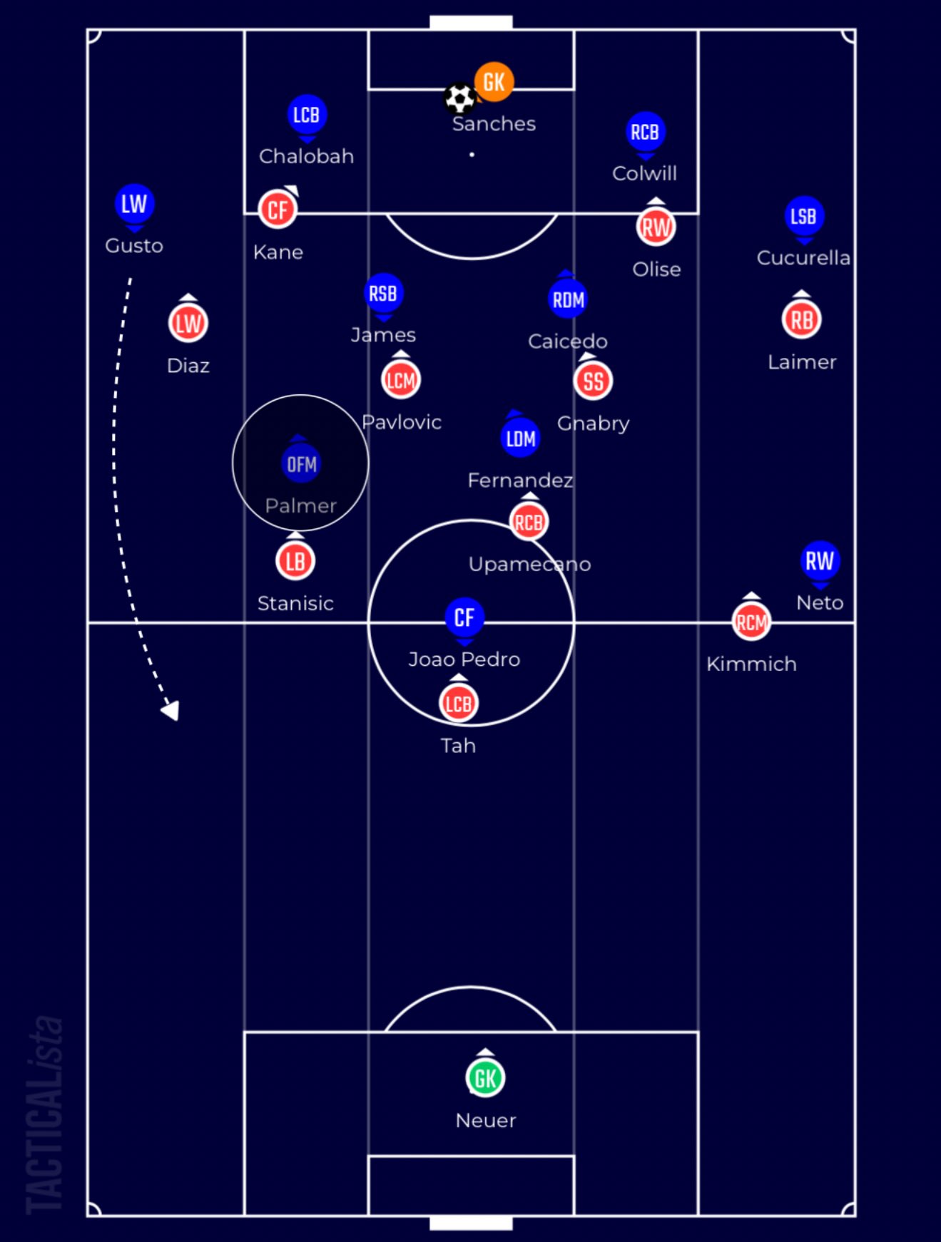 «Челси» может воспользоваться своим стартовым составом, смещая крайних защитников вперед и создавая дополнительного игрока (например, Кукурелья), чтобы пробивать плотный персональный прессинг соперника.