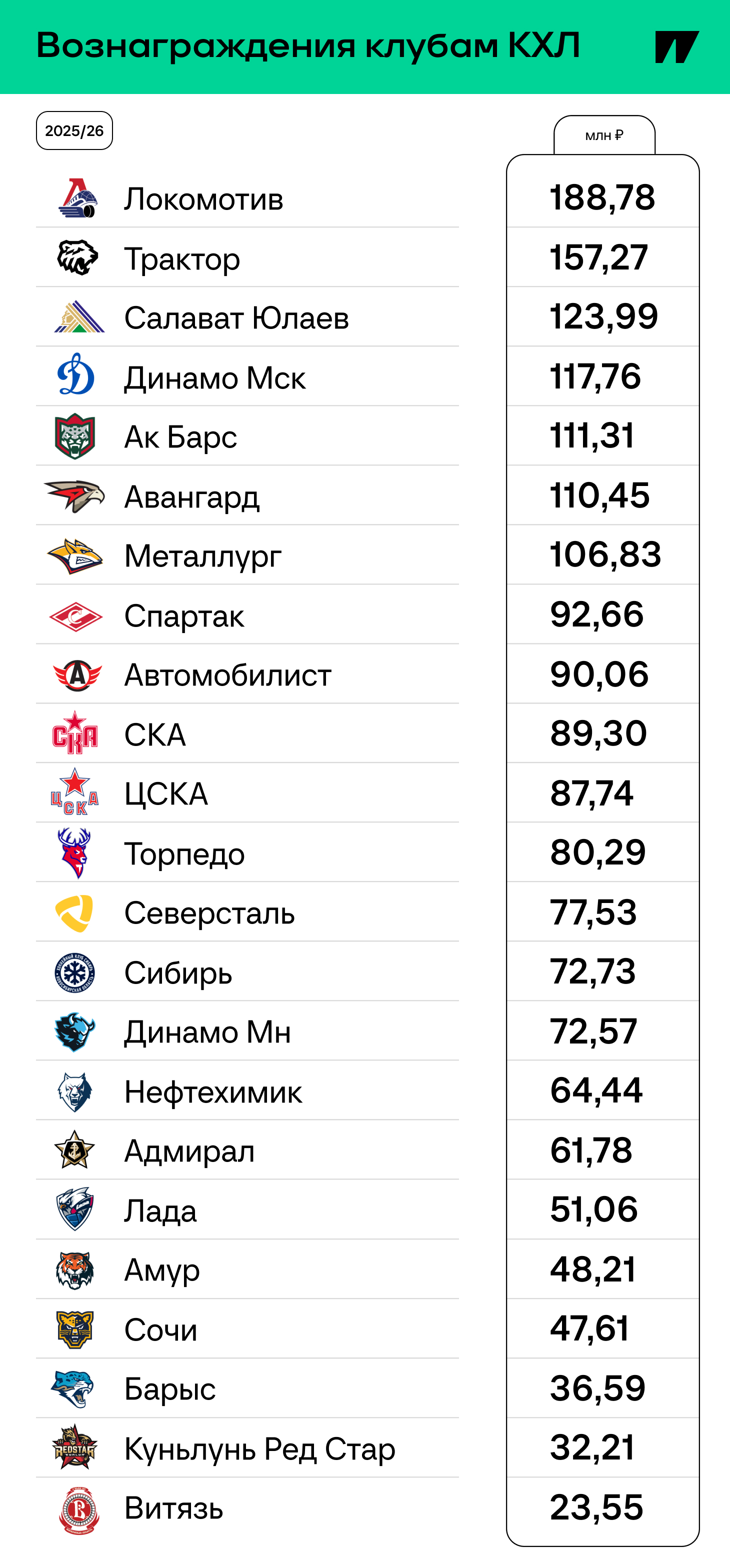 Наибольшую сумму по итогам сезона-2024/2025 собрал «Локомотив» (188,78 млн) рублей, меньше всех – «Витязь» (23,55 млн).