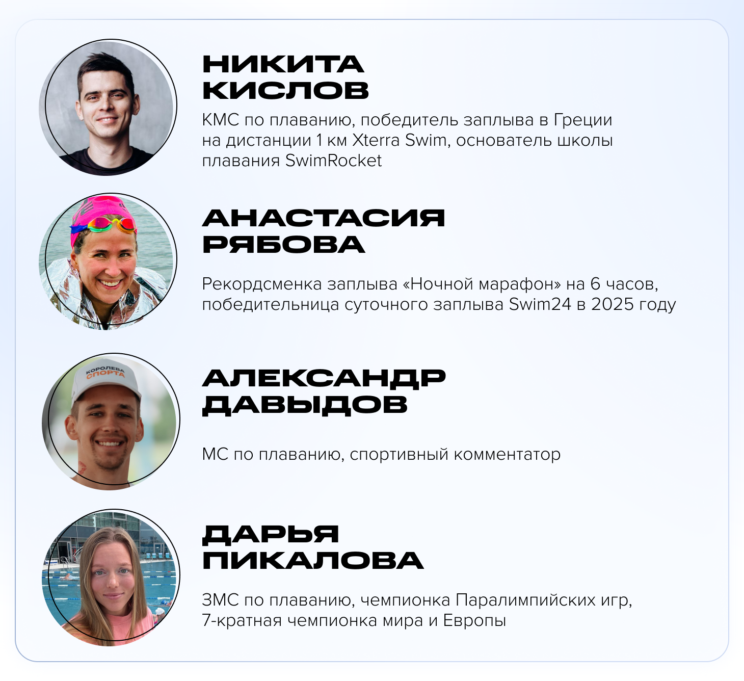 Никита Кислов: Важно понять эти самые потребности. Если вы быстрый пловец, а у вас бабулечка на дорожке, попросите ее перейти, скажите, что сейчас у вас будет активная тренировка с множеством брызг. Большинство пловцов так и делают: сначала просят, а если не помогло, то условная бабушка сама уйдет от брызг и волн на другую дорожку, потому что поймет, что ей некомфортно.
