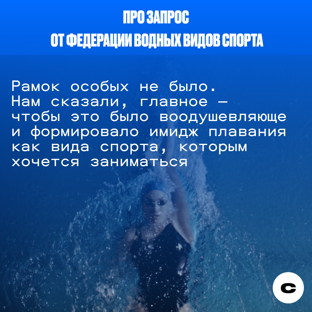 Рамок особых не было, нам сказали. Главное — чтобы это было воодушевляюще и формировало имидж плавания как вида спорта, которым хочется заниматься.