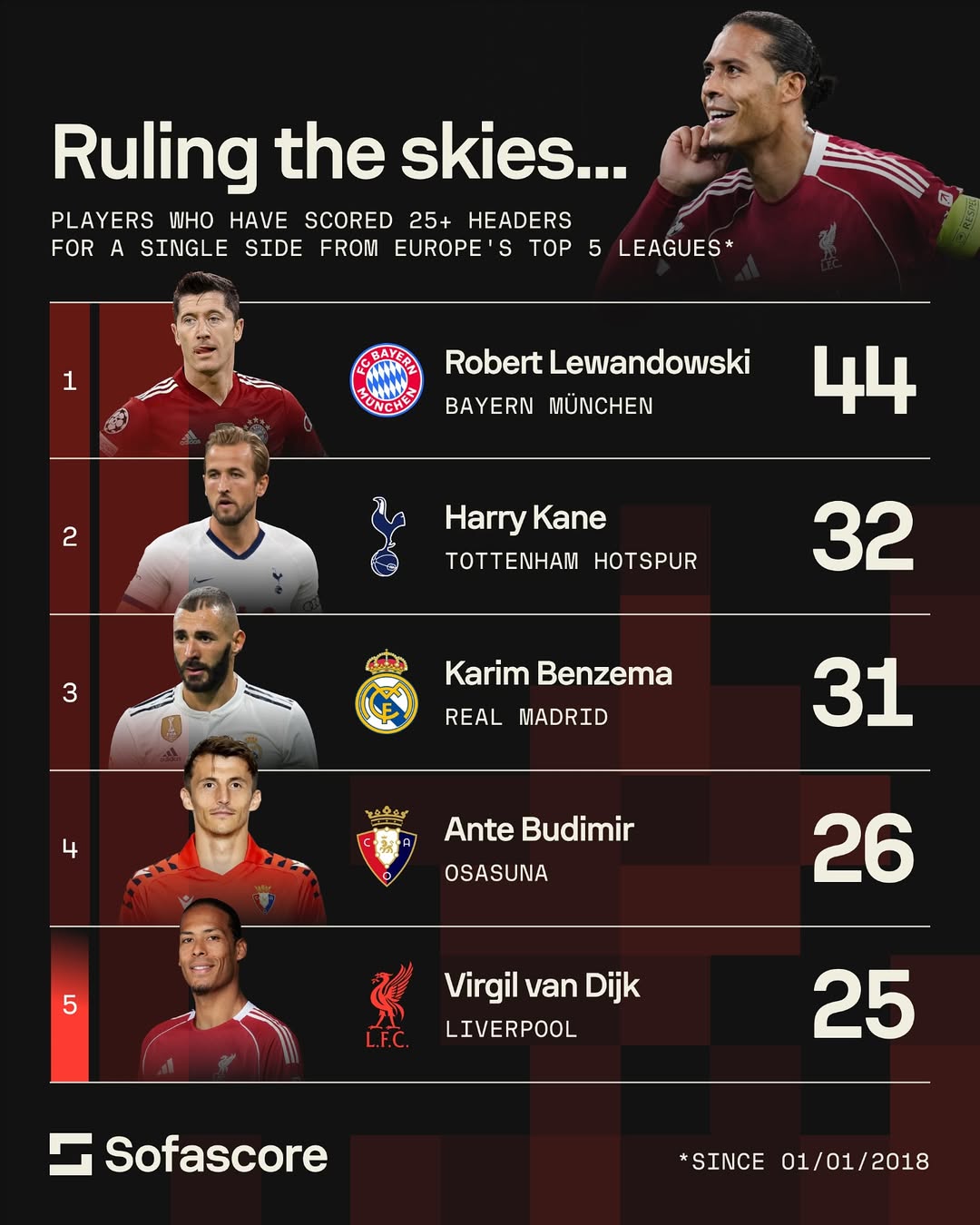 Голландец теперь вошел в топ-5 игроков по мячам, забитым головой за один клуб с 2018-го – с момента перехода Вирджила в «Ливерпуль» у него таких голов 25. В рейтинге выше защитника только форварды: Роберт Левандовски (44 за «Баварию»), Харри Кейн (32 за «Тоттенхэм»), Карим Бензема (31 за «Мадрид») и Анте Будимир (26 за «Осасуну»).