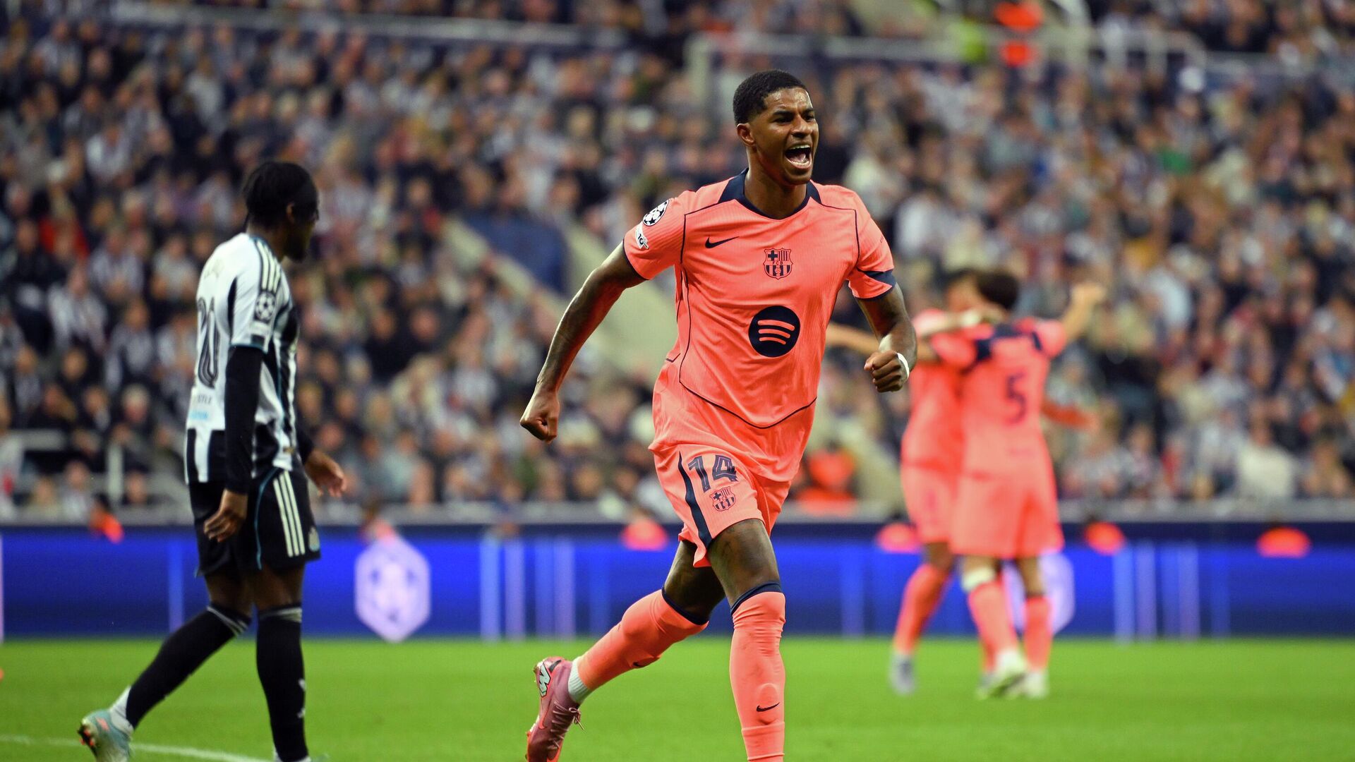 Прекрасный стадион Сент-Джеймс Парк становится ареной матча между «Ньюкаслом» с Сандро Тонали (в стартовом составе). На этот раз Флик выставляет тройку в атаке из Рафиньи, Фермина Лопеса и Рэшфорда (Ямал отсутствует) в поддержку Левандовского, тогда как Хау делает ставку на быстрый трио из Барнса, Гордона и Эланги. Именно последние двое создают первую голевую возможность через пять минут, но англичанин не сумел принять изящный пас шведа на границе вратарской. Жоан Гарсия парирует попытку Барнса на 24-й минуте, в то время как «Барселона» испытывает трудности с настойчивостью в игре. Первый тайм заканчивается со счетом 0-0, который меняется на 58-й минуте, когда Кулес открывают счет: Рэшфорд принимает навес от Кунде и головой отправляет мяч в сетку 1-0. Экс-игрок «Манчестер Юнайтед» затем повторяет это на 67-й минуте, мощным ударом с правой ноги из-за пределов штрафной насчитывает 2-0. Прямой удар и поперечина, выполненные британцем, ставят «Ньюкасл» на колени, но команда пытается оправиться на 90-й минуте с помощью Гордона. Бывший игрок «Эвертона» сокращает отставание, внимая «Барселоне», которая всё же успешно защищает финальный счет 2-1 после финального свистка.