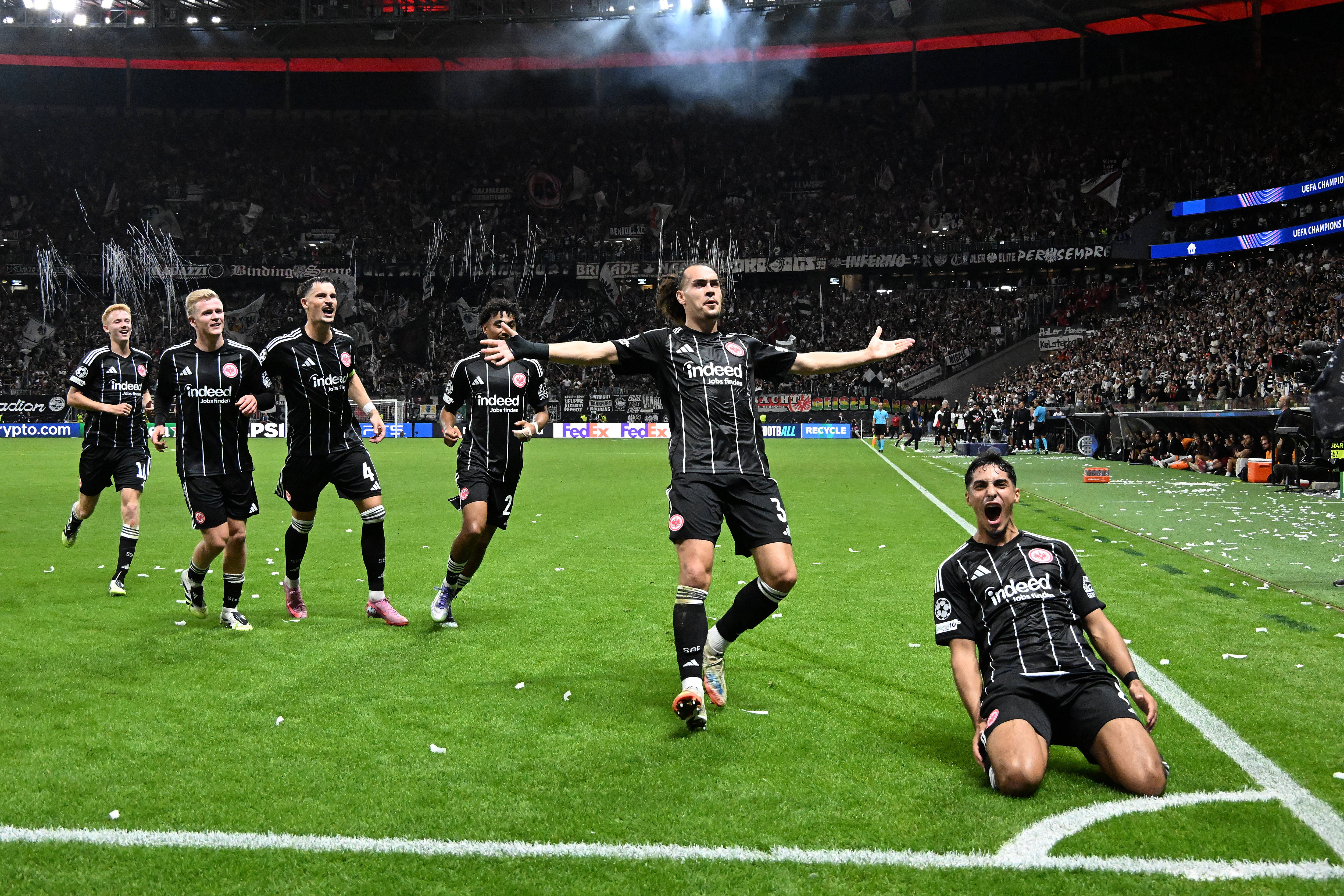 «Айнтрахт» Франкфурт и «Галатасарай» встречаются на стадионе Deutsche Bank Park, где встречу судит итальянский арбитр Марко Гуида. Осимхен травмирован, а Икарди начинает матч на скамейке запасных. Открывает счет для гостей Акгюн на 8-й минуте после передачи Санэ. Франкфурт получает удар, постепенно начинает играть и на 38-й минуте сравнивает счёт: Доан вызывает автогол Санчеса, восстанавливая равновесие 1-1. Немцы затем добавляют высокую скорость и вырываются вперед, залетая 3-1 в добавленное время первого тайма: Узун открывает счет на 45+2, а Буркардт забивает головой после штрафного удара Чаиби на 45+5. Буркардт повторно забивает на 66-й минуте, устанавливая счёт 4-1. «Галатасарай» полностью пропадает с поля и пропускает финальный 5-1 от Кнауфф на 75-й минуте, завершив вечер худшим образом, начавшимся хорошо.