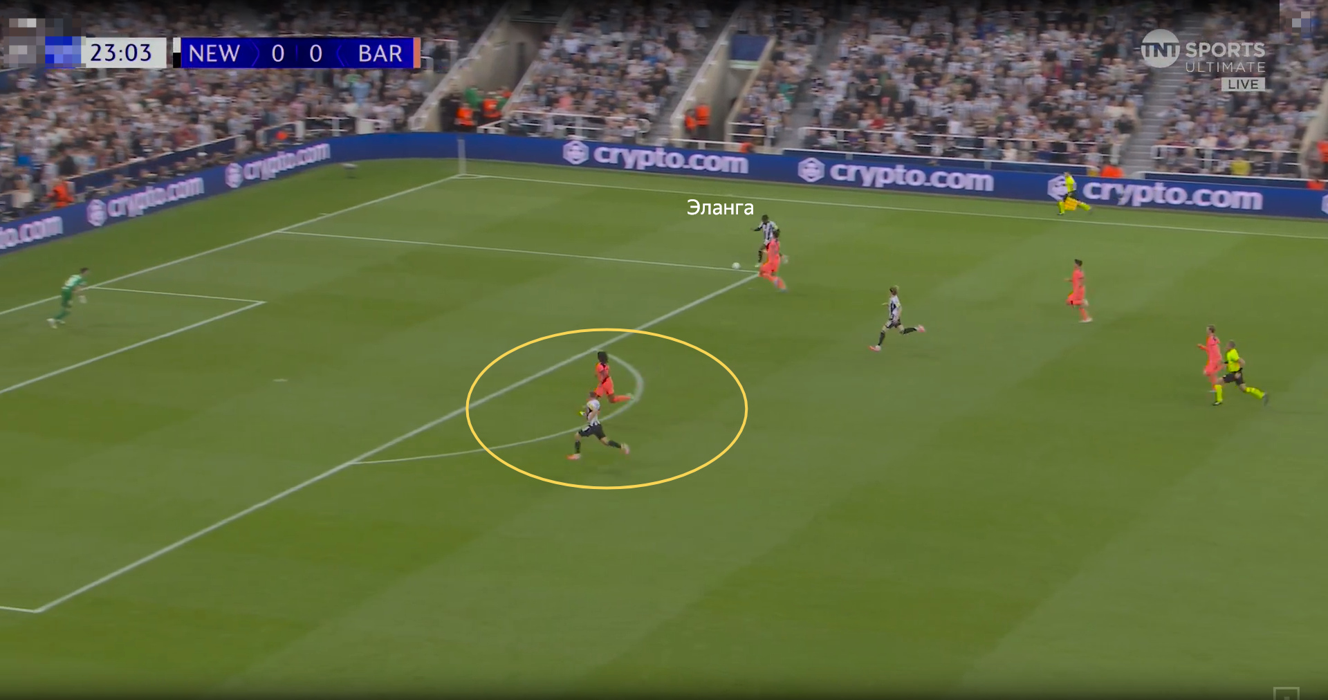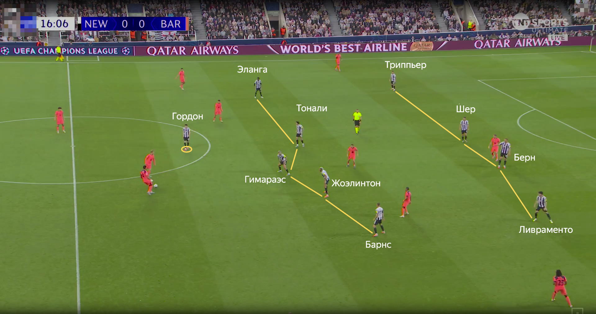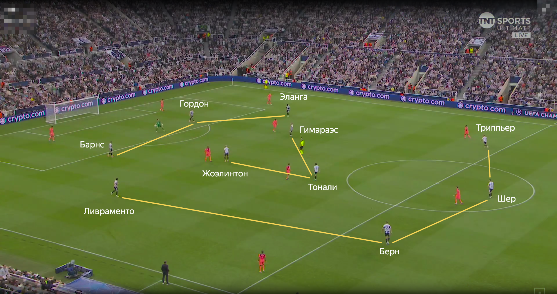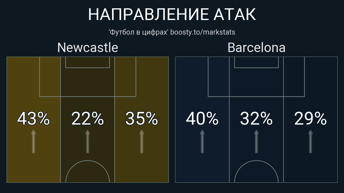 В теории мы могли увидеть обоюдную прессинг-дуэль. Но «Ньюкасл» постарался минимизировать шансы подставиться под давление «Барселоны». Команда Эдди Хау всегда начинала атаки длинными передачами в борьбу.