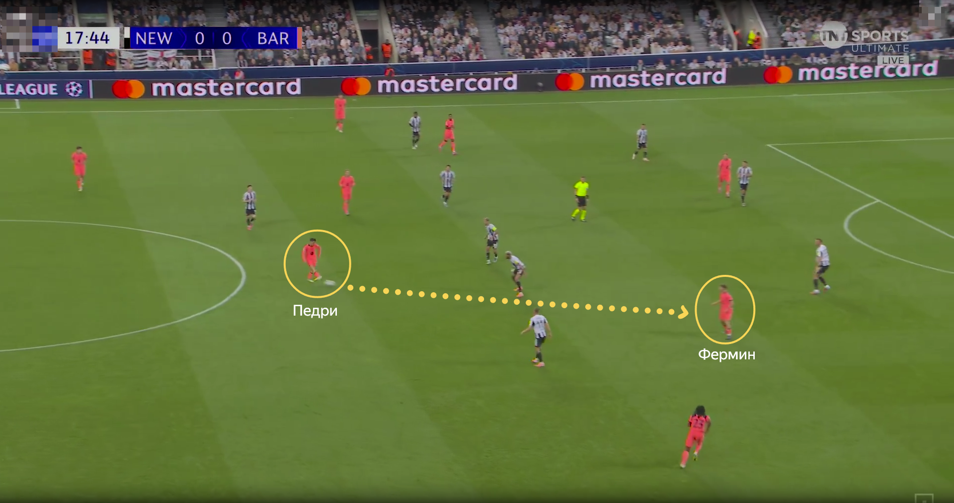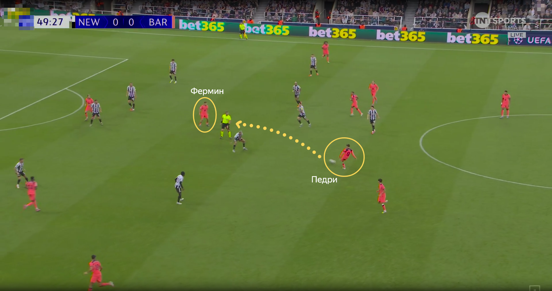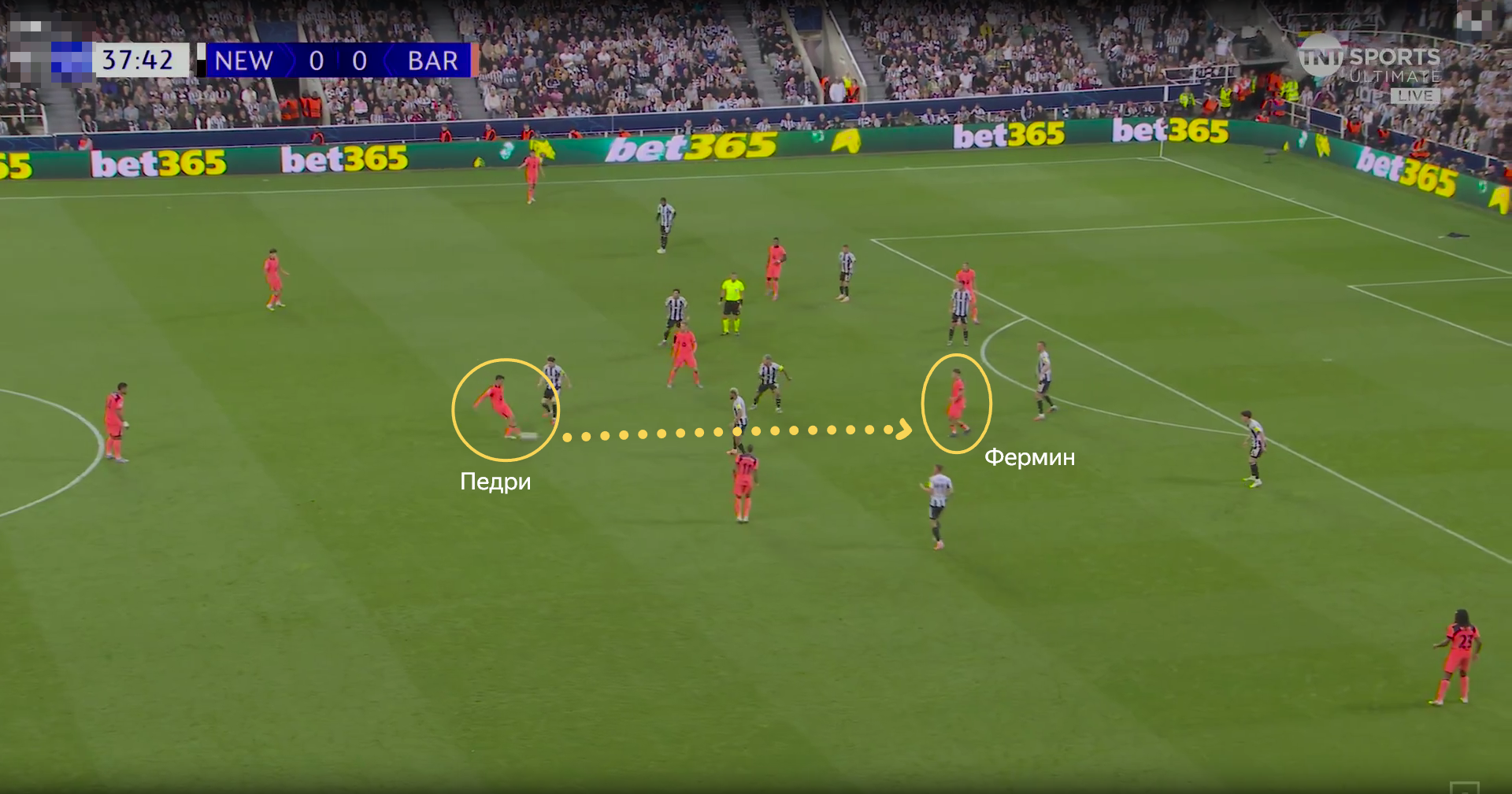 Обратите внимание на то, что адресатом во всех эпизодах был Фермин. Лопес очень здорово умеет находить свободные пространства и открываться в них. Вместе с умением Педри находить партнеров передачами получается отличная связка.