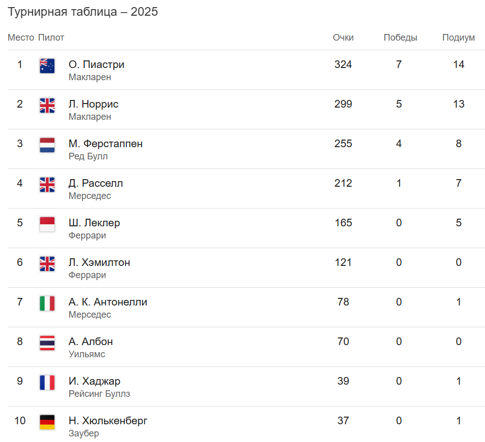 Сход лидера чемпионата стал редким подарком для его конкурентов, особенно для Ландо Норриса. Этот инцидент открыл для Норриса, стартовавшего с седьмого места, идеальную возможность резко сократить отставание в личном зачете. Однако, несмотря на столь благоприятные обстоятельства, Норрис не смог в полной мере воспользоваться шансом. Его неудачи в гонке, включая медленный пит-стоп и трудности с обгонами, помешали ему извлечь максимальную выгоду. Он сократил отрыв лишь на шесть очков, с 31 до 25, что эквивалентно одной победе. Таким образом, катастрофа Пиастри не нанесла его сопернику «решающего удара», и интрига в борьбе за титул осталась жива.