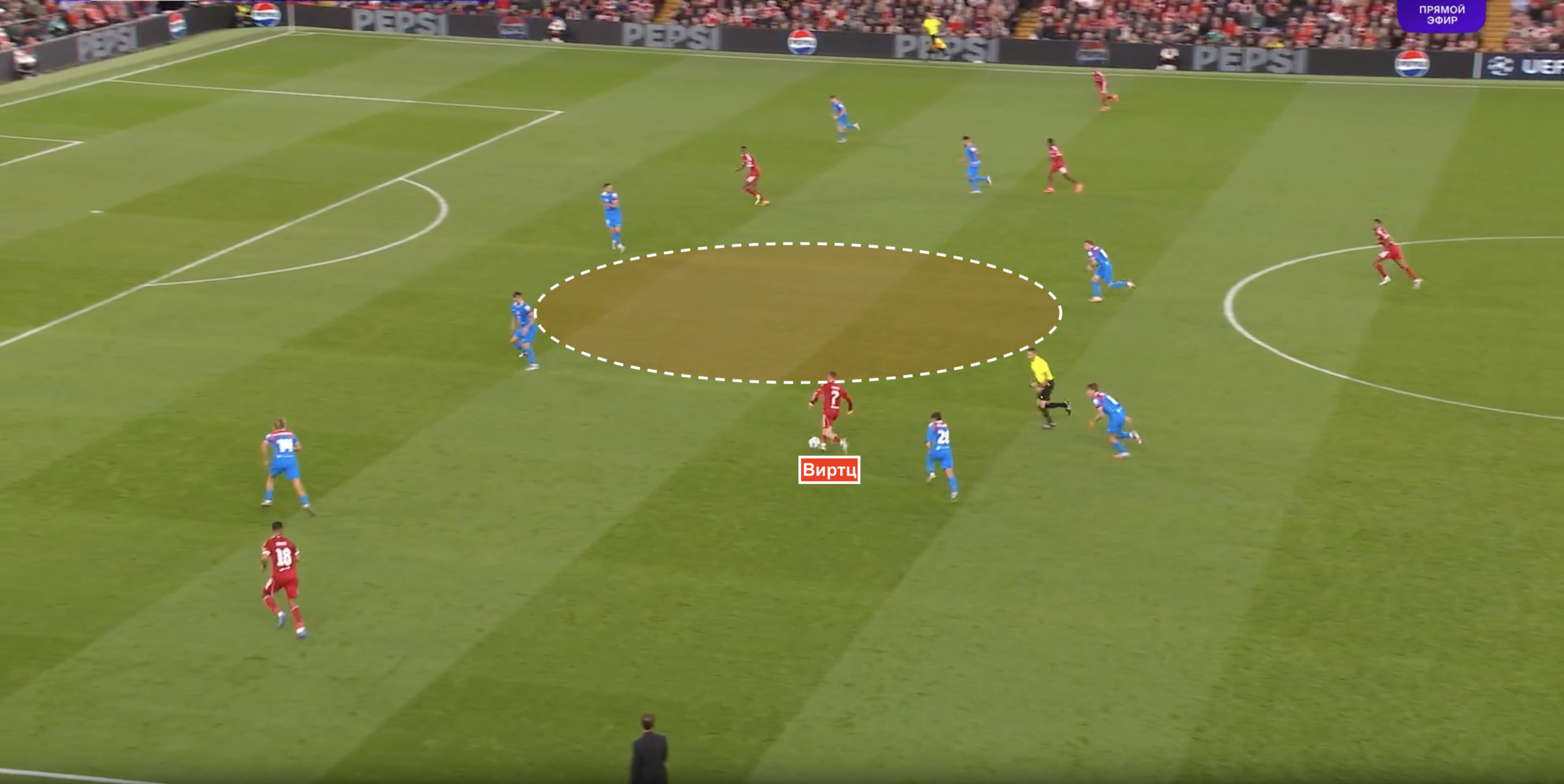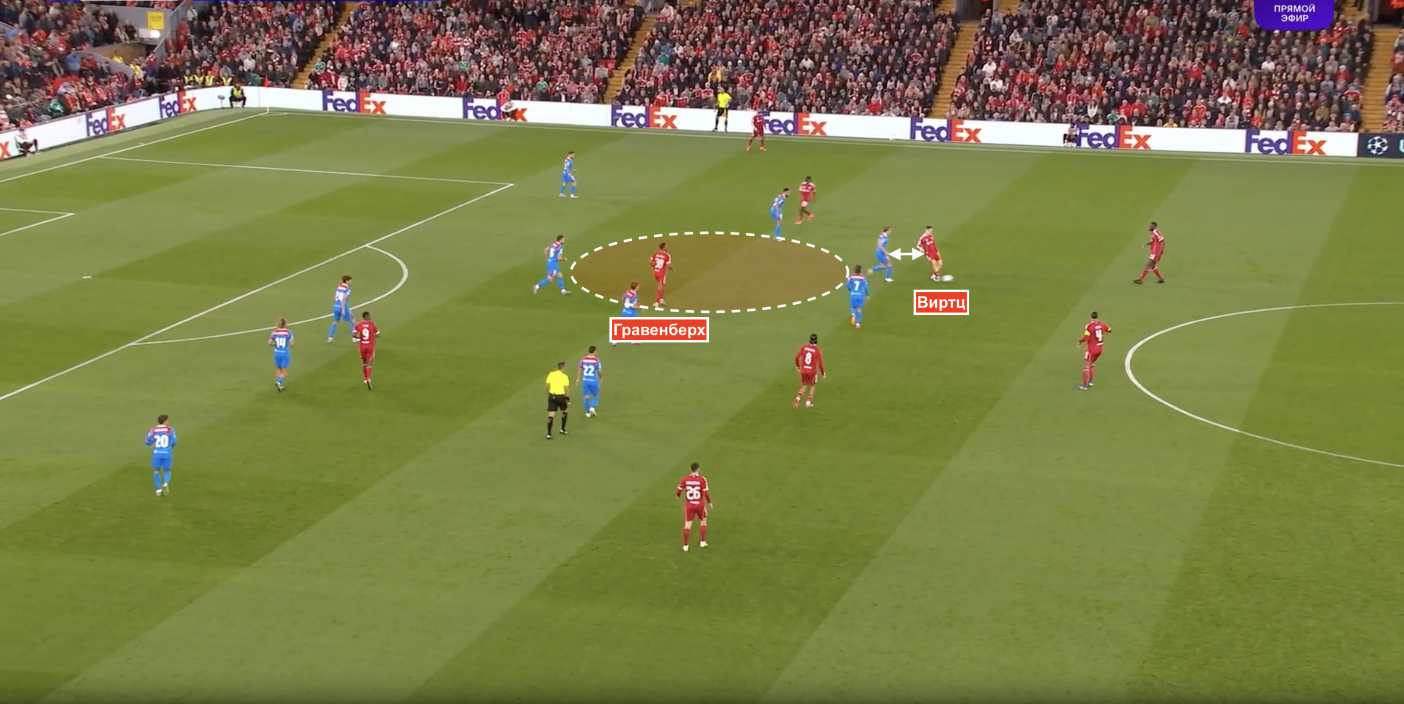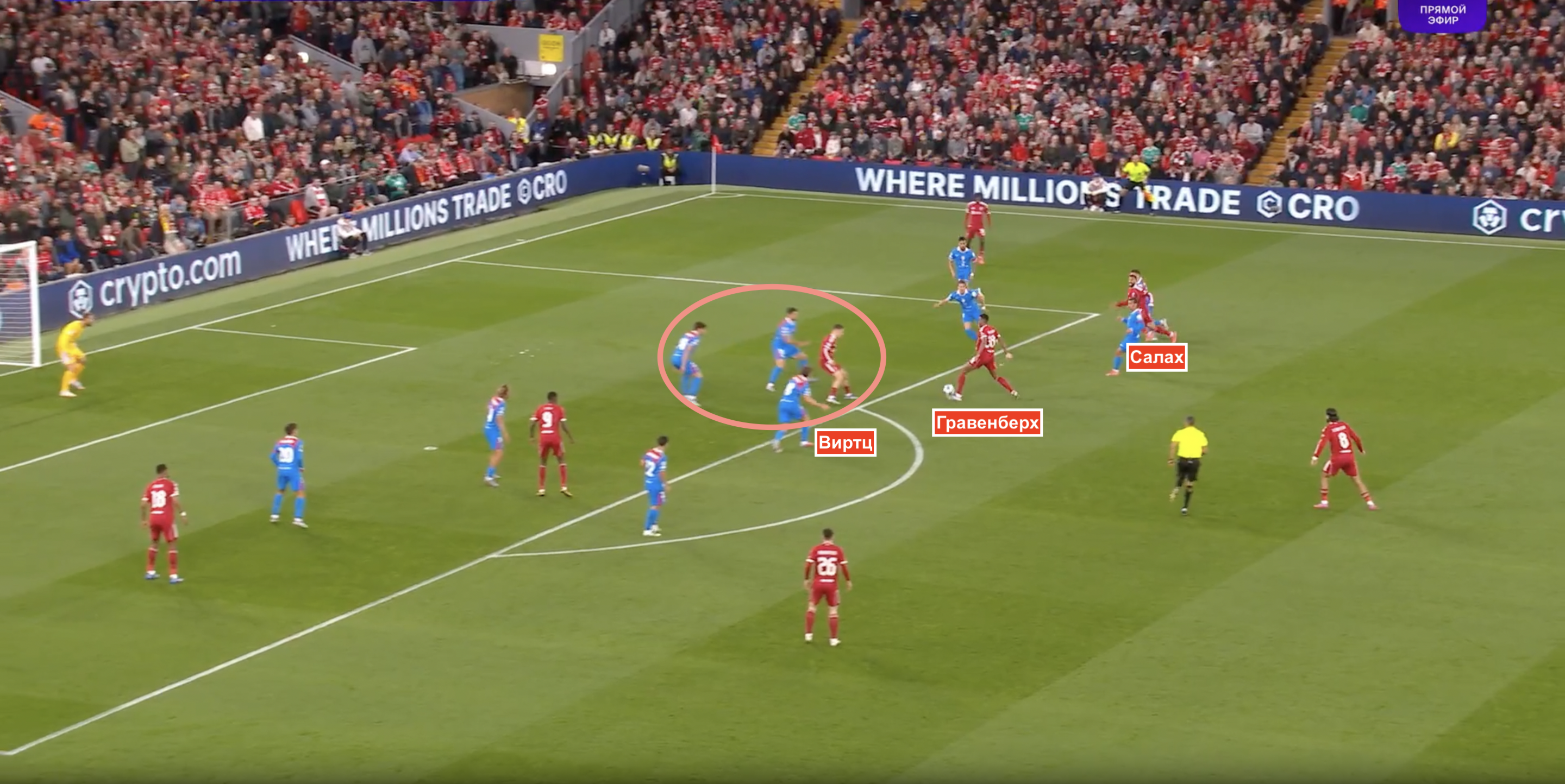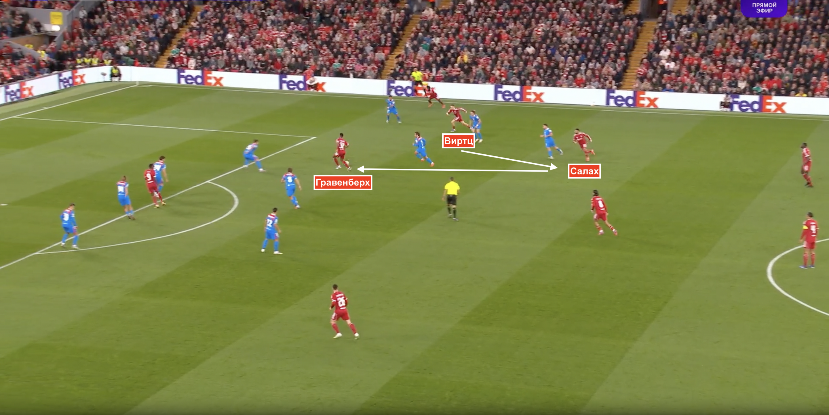 Результат игровой ситуации — в опорной зоне своими перемещениями и взаимодействиями с Конате, а затем с Салахом открывает пространство для Гравенберха.