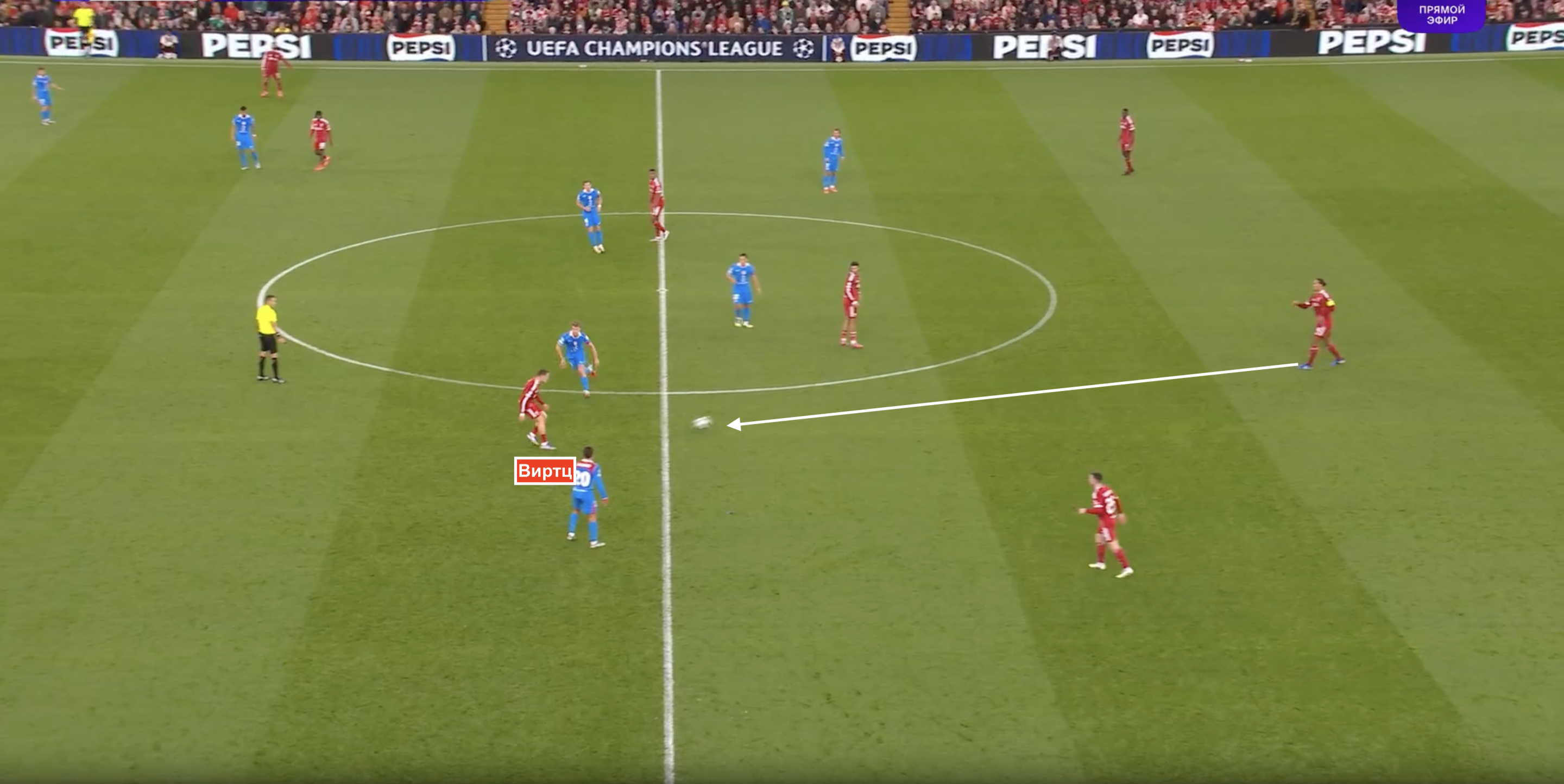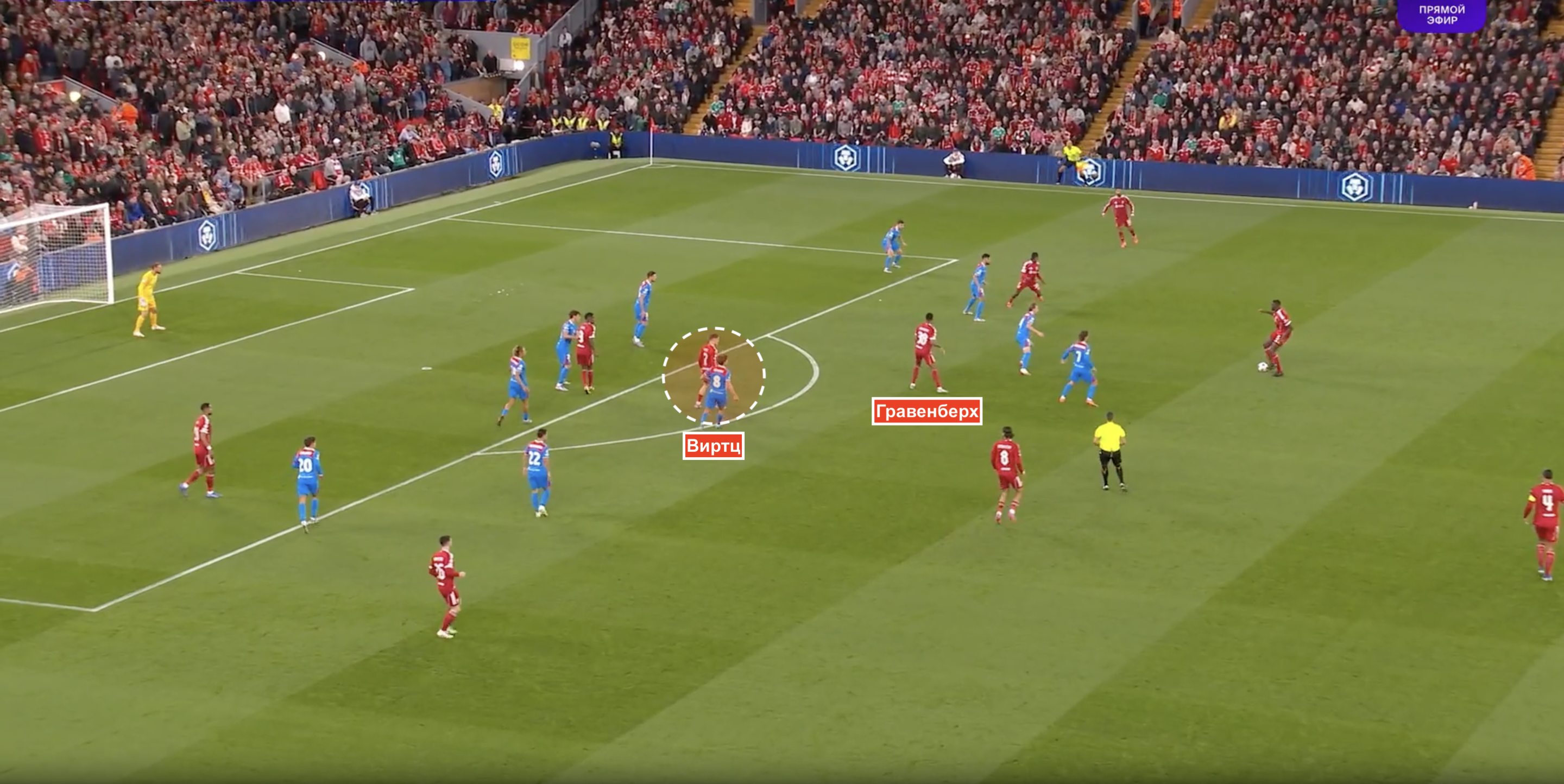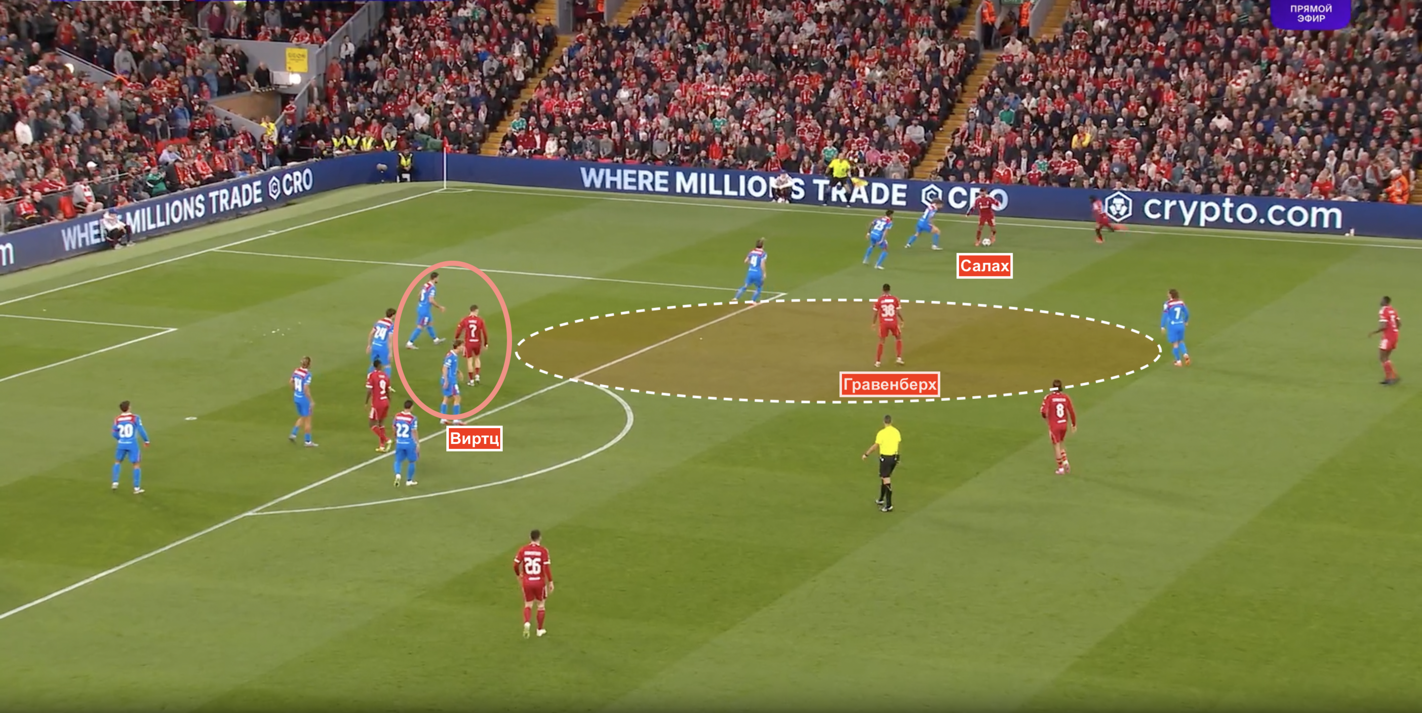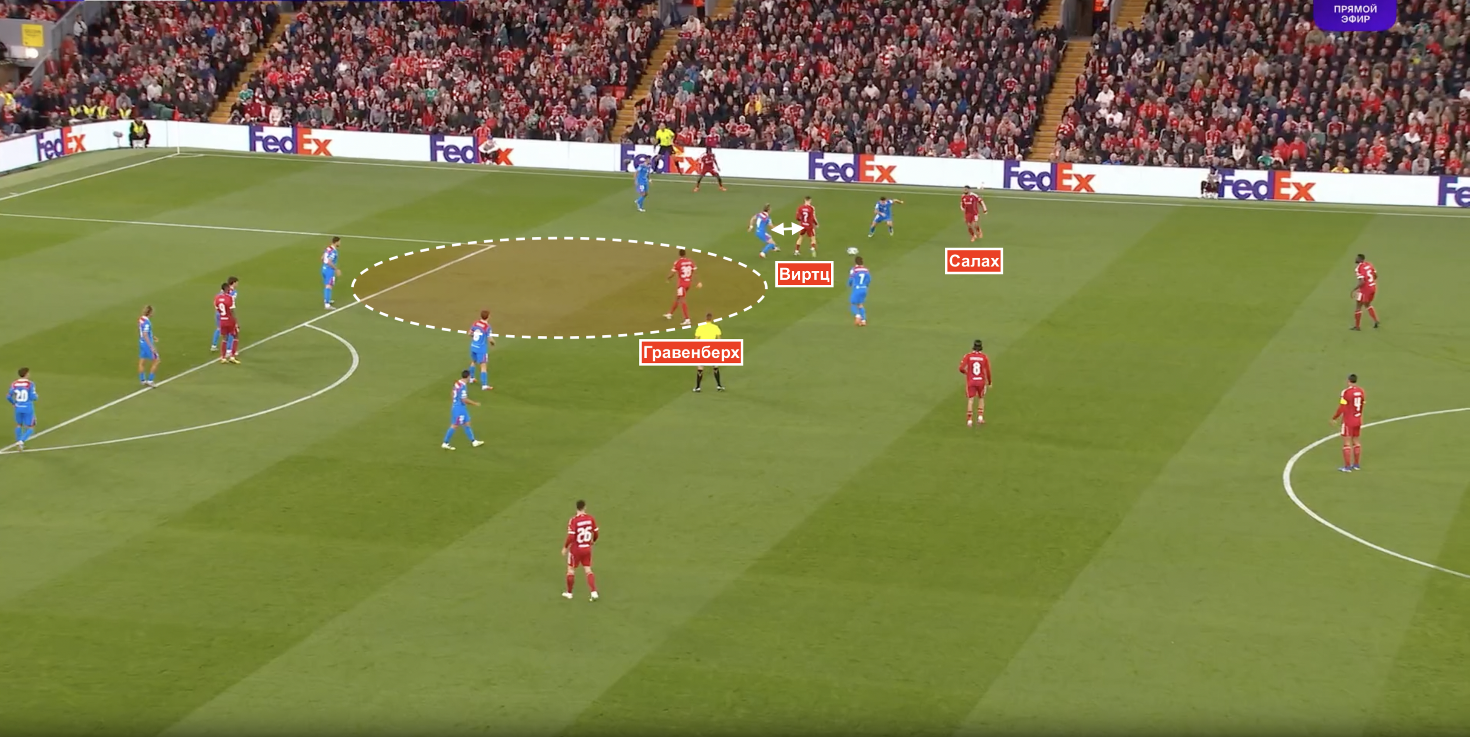 Перепас Виртца с Салахом, и Гравенберх получает мяч от египтянина лицом к воротам соперника. Итог: заработанный фол вблизи штрафной площади, который закончился таким ранним голом «Ливерпуля».