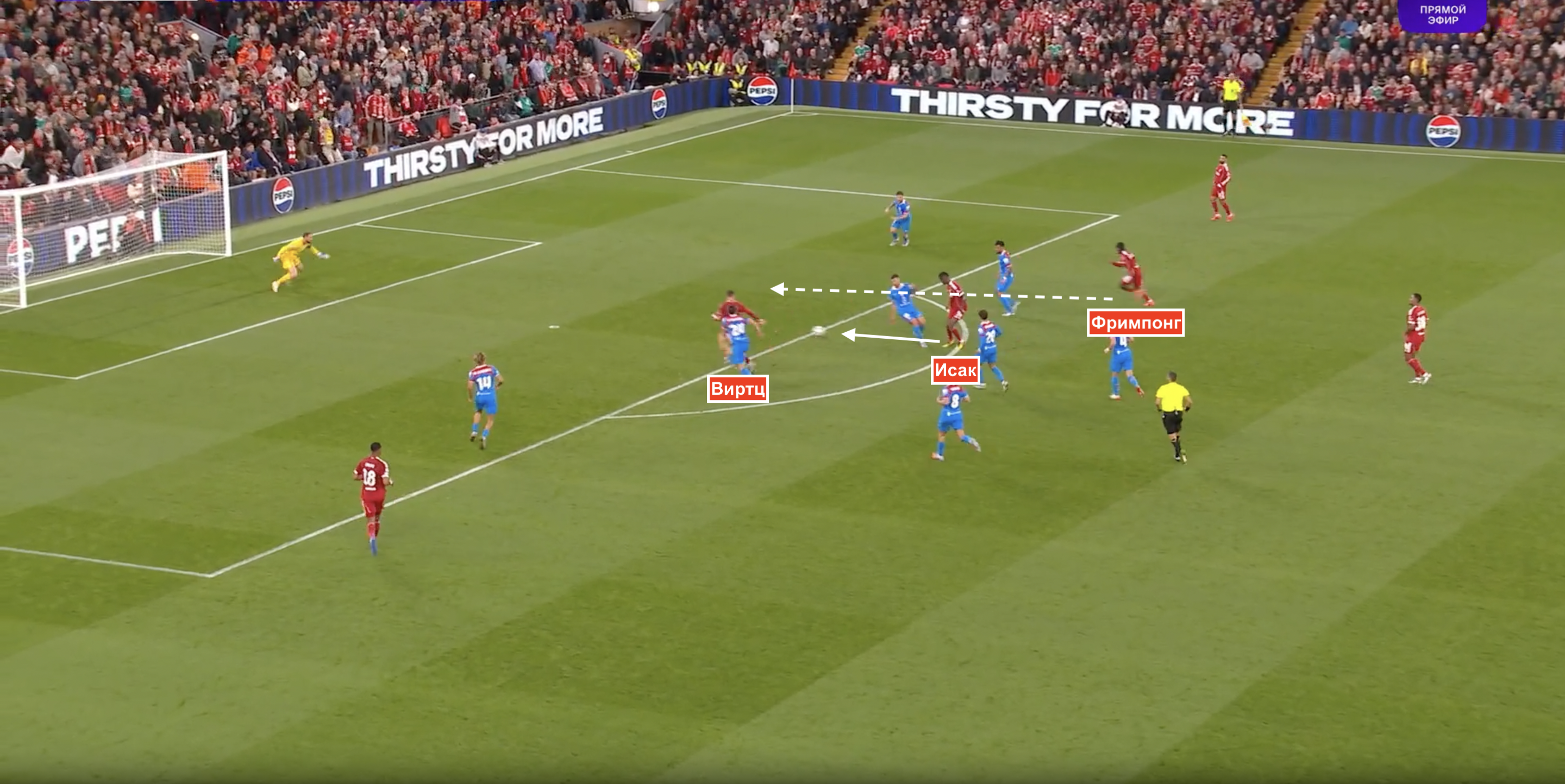 Пример первый: Флориан опускается ниже, затягивает за собой одного из опорных полузащитников соперника. Отыгрывается с Конате, уходит ближе к флангу. Конате отправляет мяч на Салаха.