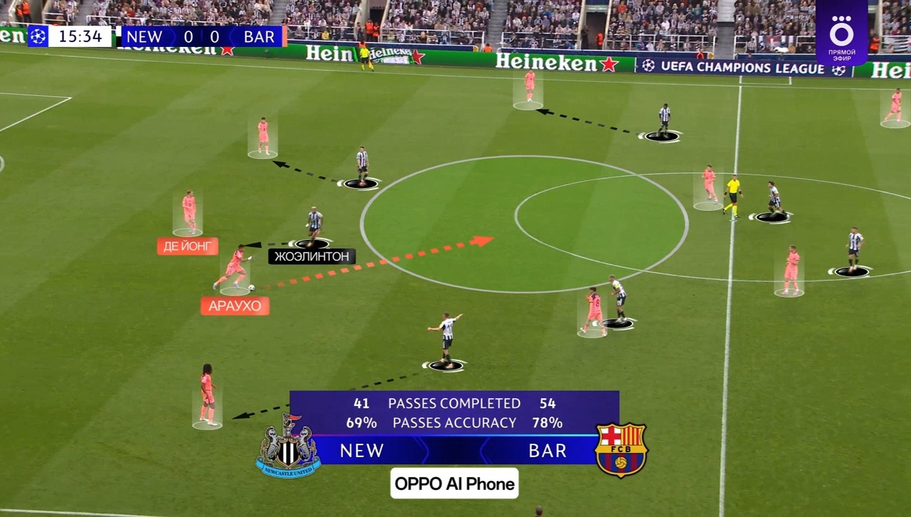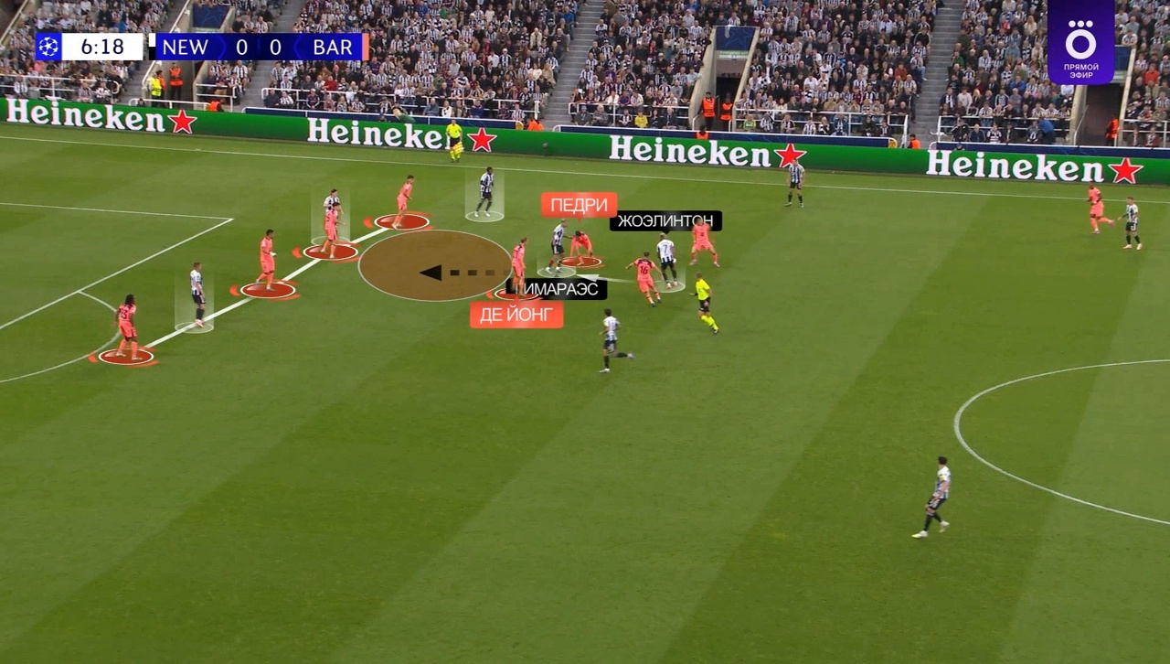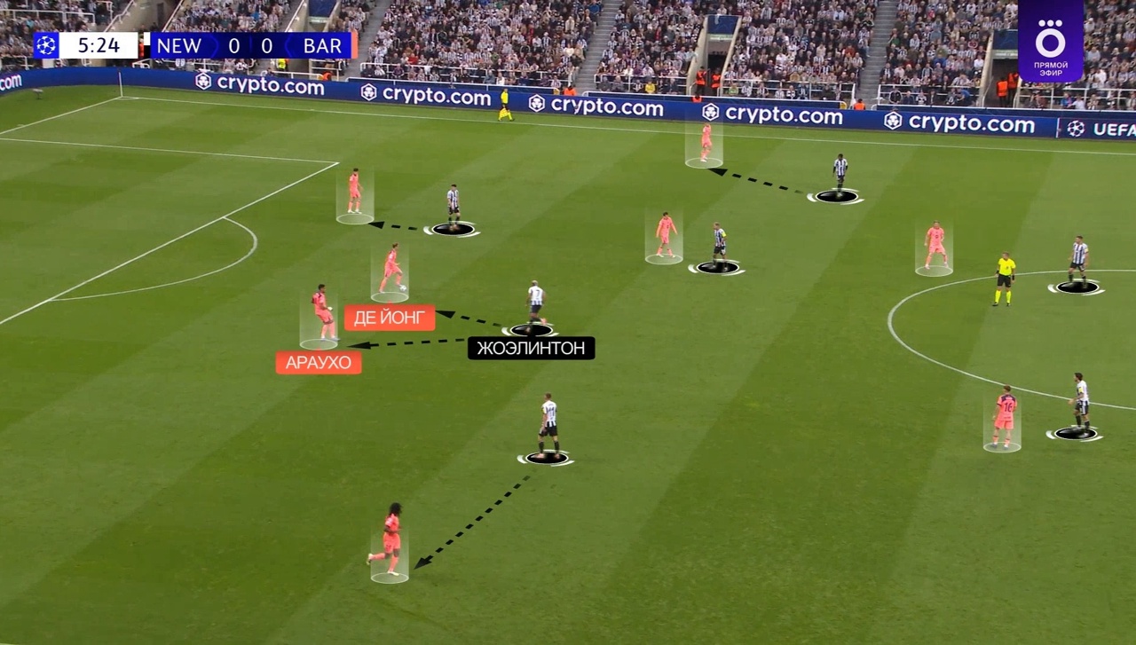 1. Движение де Йонга. Френки – возможно, главный специалист в мире по игре под давлением. Он здорово читает прессинг соперника и адаптирует свое движение под него. В моменты, когда «Ньюкасл» оставлял Араухо свободным, де Йонг уводил Жоэлинтона в неудобные зоны таким образом, чтобы он не смог контролировать игроков, и чтобы у партнеров были коридоры для передач/проходов.