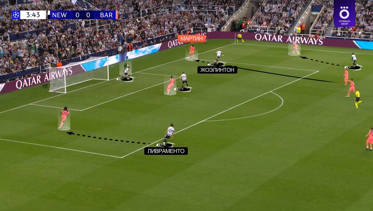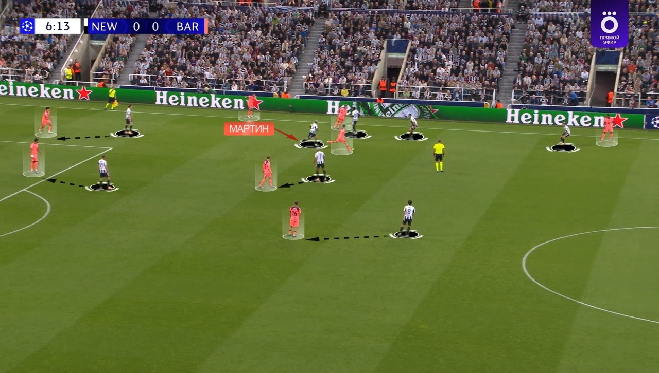 Мартин здесь не смог точно вбросить аут, мяч достался «Ньюкаслу», который сразу же провел опасную атаку через центр – здесь Педри упустил Гимараэса (сам Педри после этого эпизода даже извинялся перед партнерами):