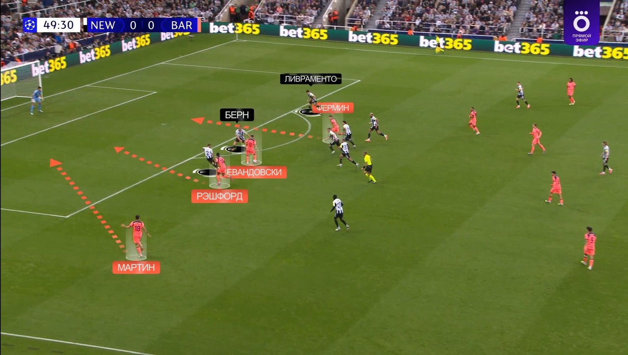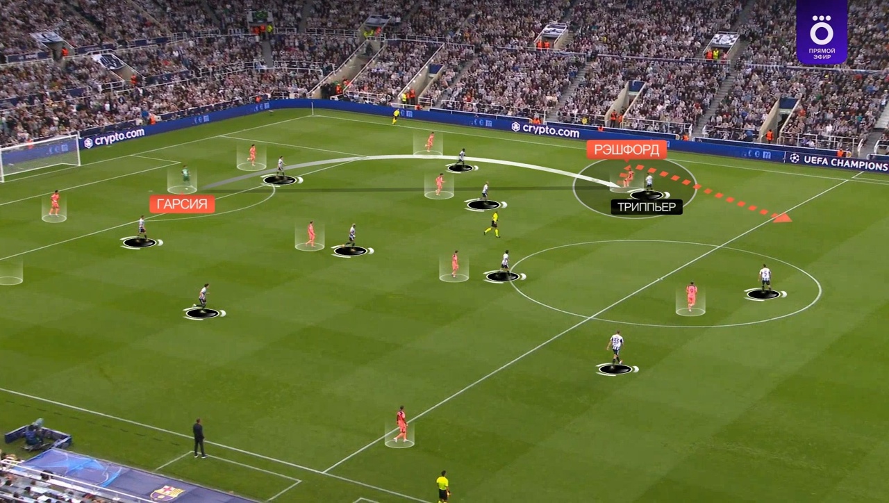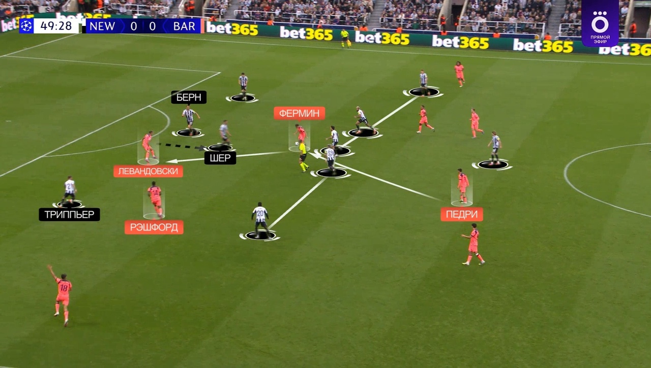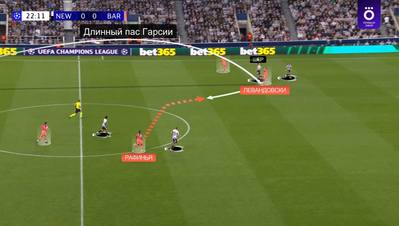 Вот пример: здесь Гарсия забрасывает на Левандовского, он выигрывает вверх, Рафинья на подборе – «Барса» вскрывает уязвимость прессинга «Ньюкасла» (равные соотношения сзади) и атакует 4-в-4: