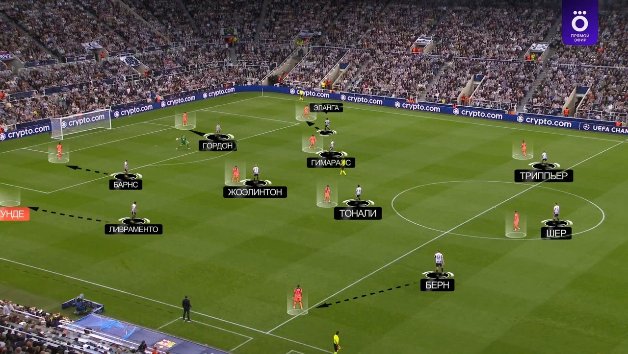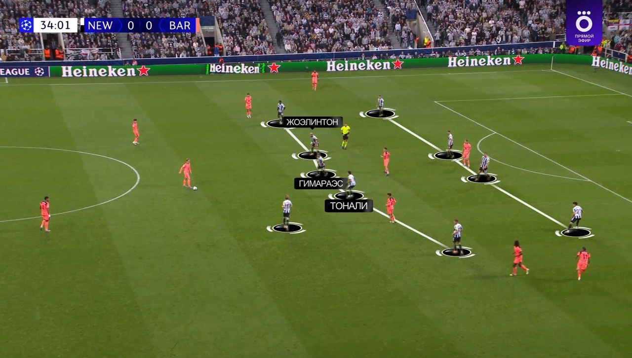 Акцент «Ньюкасла» – перекрыть центр поля, через который «Барса» Флика очень любит разыгрывать комбинации. Тройка Жоэлинтон – Тонали – Гимараэс располагалась очень узко, пытаясь перекрыть коридор для потенциальной продвигающей передачи.