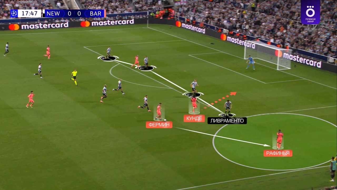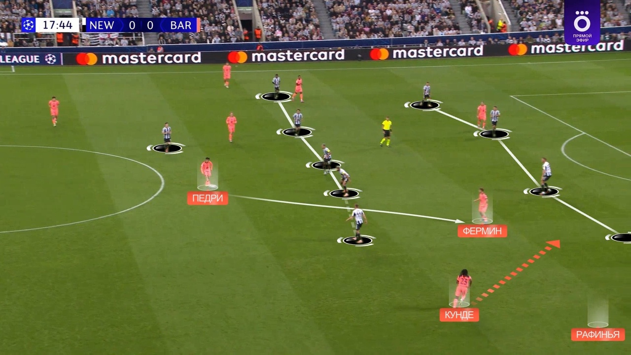 С помощью такого перегруза «Барса» и создала наибольшую угрозу в этом матче. Первый пример: здесь «Ньюкасл» оставляет большое пространство между линиями – там открывается Фермин под передачу Педри, в Кунде уже в этот момент начинает рывок по полуфлангу: