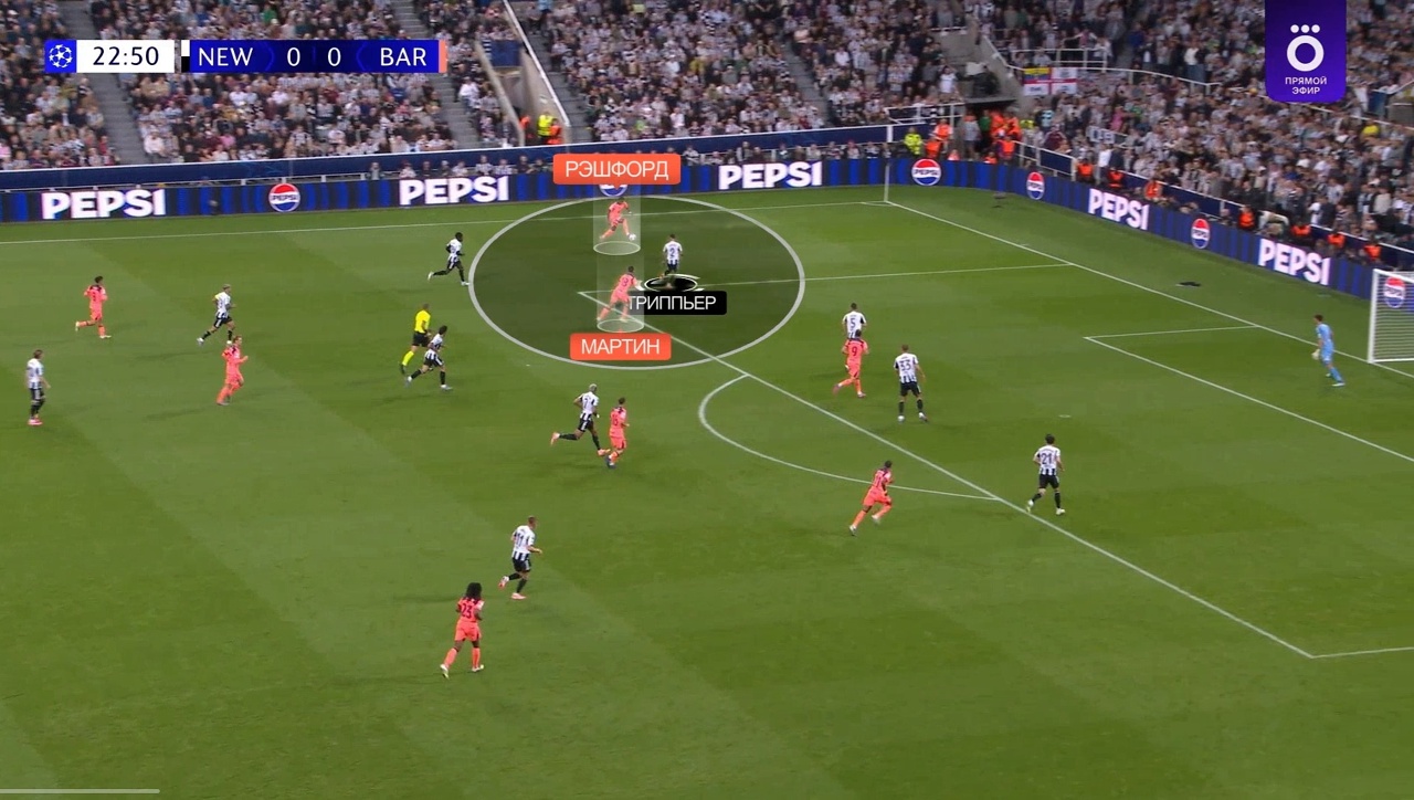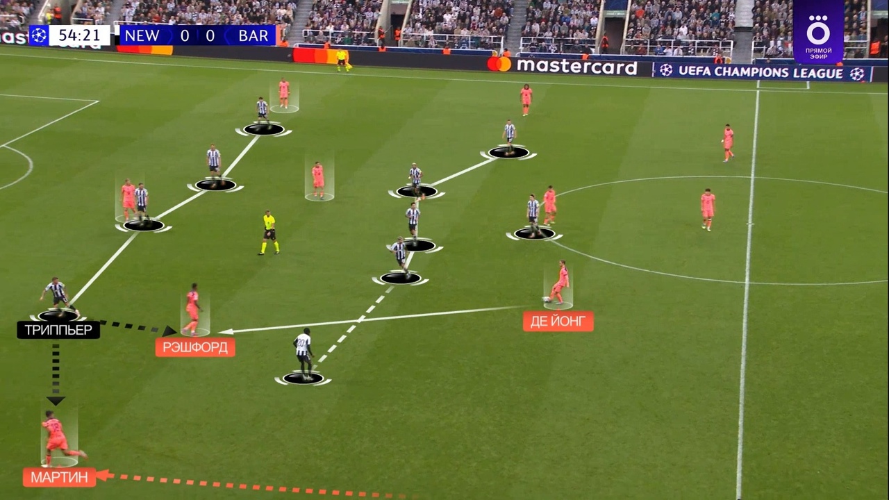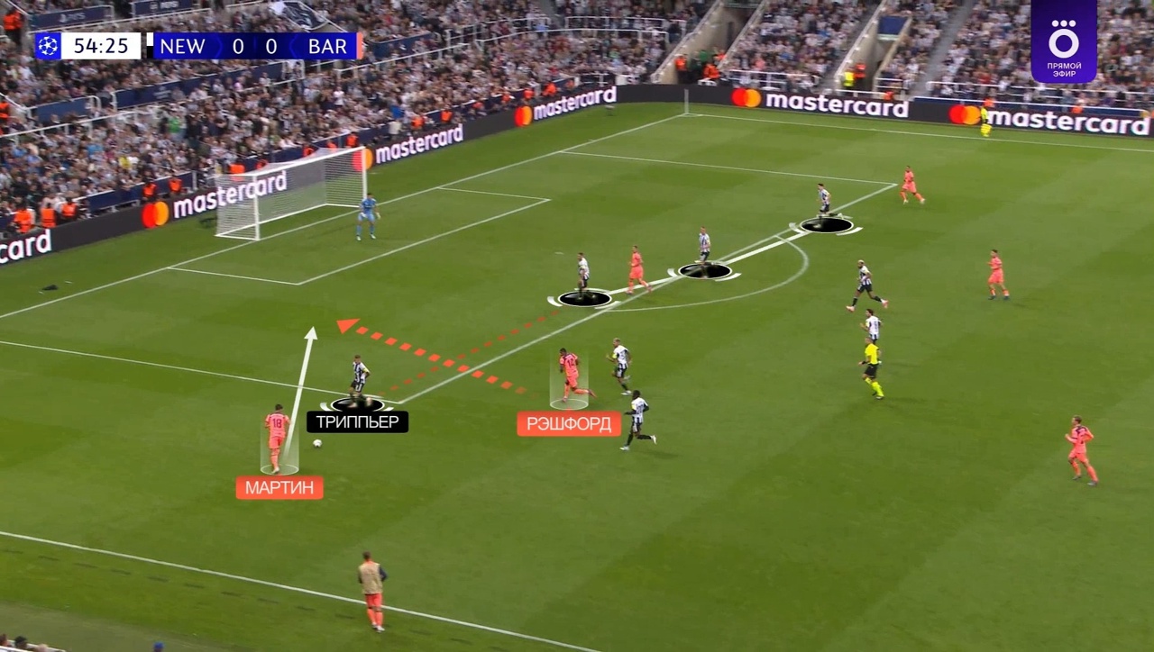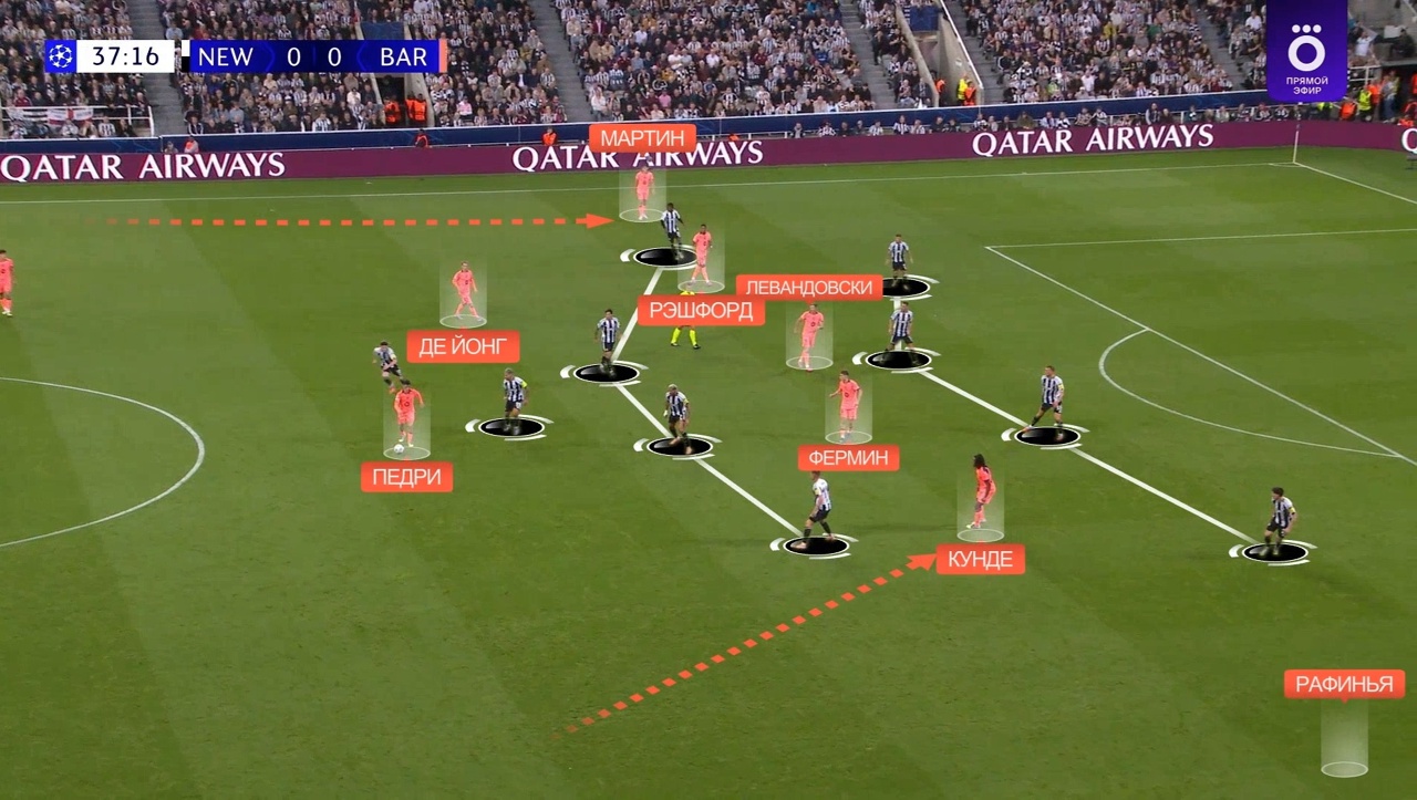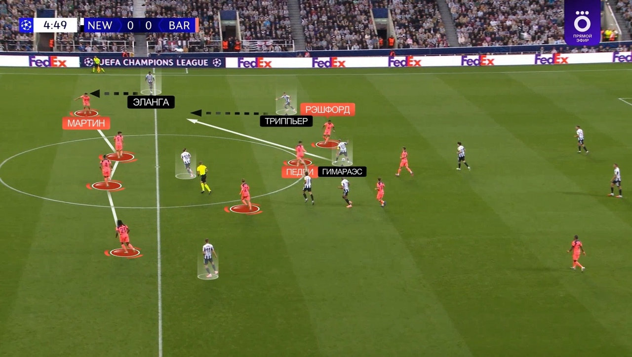 Педри выдвигается на Гимараэса, а Рэшфорд упускает рывок Триппьера – Мартин оказывается 1-в-2 на фланге, а «Ньюкасл» атакует на скорости: