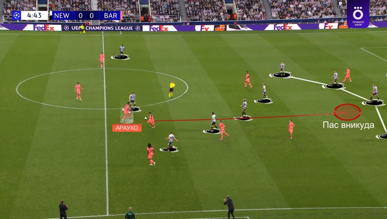 Эпизод закончился убойным моментом, где Гордон с расстрельной позиции просто не попал по мячу. Вообще, здесь «Барса» все, что могла сделать плохо, сделала плохо: Араухо в простой ситуации просто подарил мяч сопернику, Педри запоздало выдвинулся на Гимараэса, Рэшфорд смотрел футбол, вместо того, чтобы следить за Триппьером, Мартин дал Эланге себя пройти, а Араухо в штрафной легко упустил Гордона. Начало эпизода – почти один-в-один потеря Араухо в том самом матче против «ПСЖ», которая привела к его удалению.