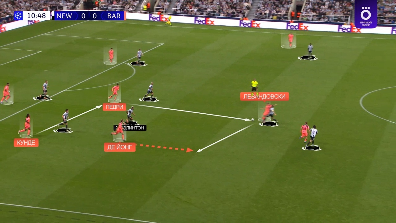 3. Индивидуальный класс игроков (особенно Педри и де Йонга). В конце концов, возникало немало эпизодов, когда «Барса» выходила из-под прессинга «Ньюкасла» не с помощью каких-то особенных тактических решений, а чисто за счет очень классной игры под давлением. Особенно выделились здесь Френки де Йонг и Педри. Они настолько изящно ускользали от своих опекунов, что те даже толком фолить на них не успевали. Как пример – великолепный выход «Барсы» из-под прессинга, где Педри и Левандовски сделали сложные передачи в касание под давлением, а де Йонг ускользнул от Жоэлинтона и разогнал атаку: