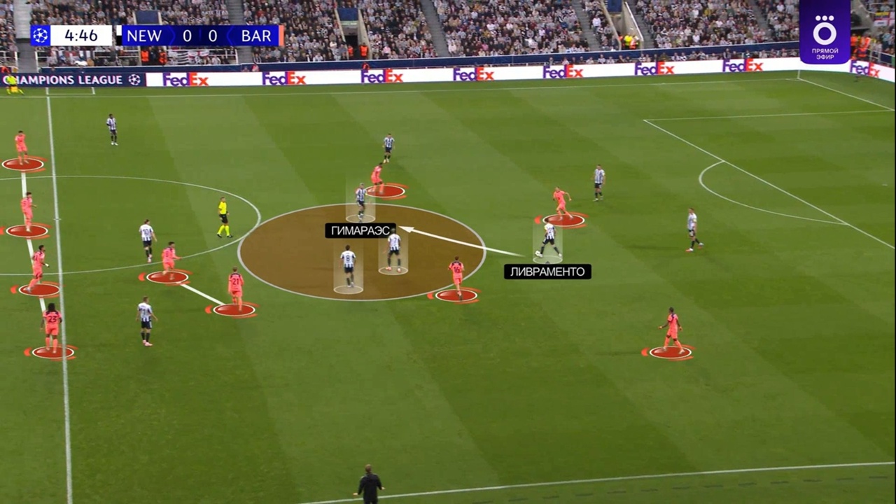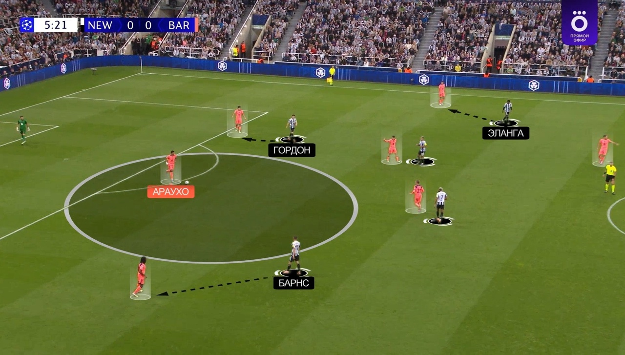 ● Более щадящий режим. В нем «Ньюкасл» прессинговал «Барсу» в менее подготовленных ситуациях. Например, когда мяч только-только достался каталонцам. В таком случае Ливраменто оставался в задней линии, Барнс играл по Кунде, а Араухо оставляли свободным, перекрывая ему остальные ближние варианты: