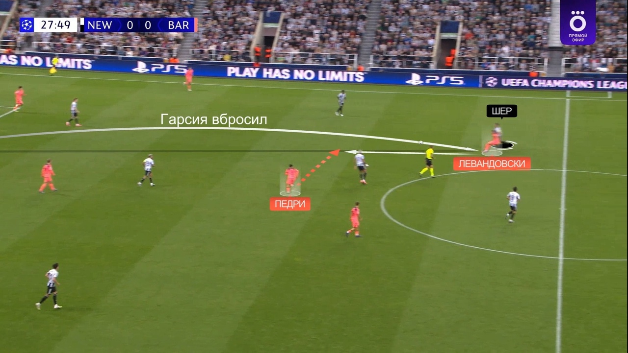Вот еще один эпизод: здесь Гарсия тоже вбрасывает рукой, только на этот раз на Левандовского. Роберт под серьезным давлением здорово сбрасывает на Педри и «Барса» выходит из-под прессинга «Ньюкасла»: