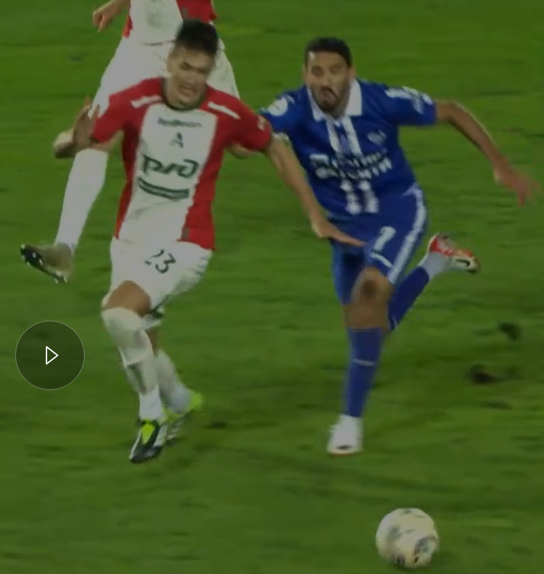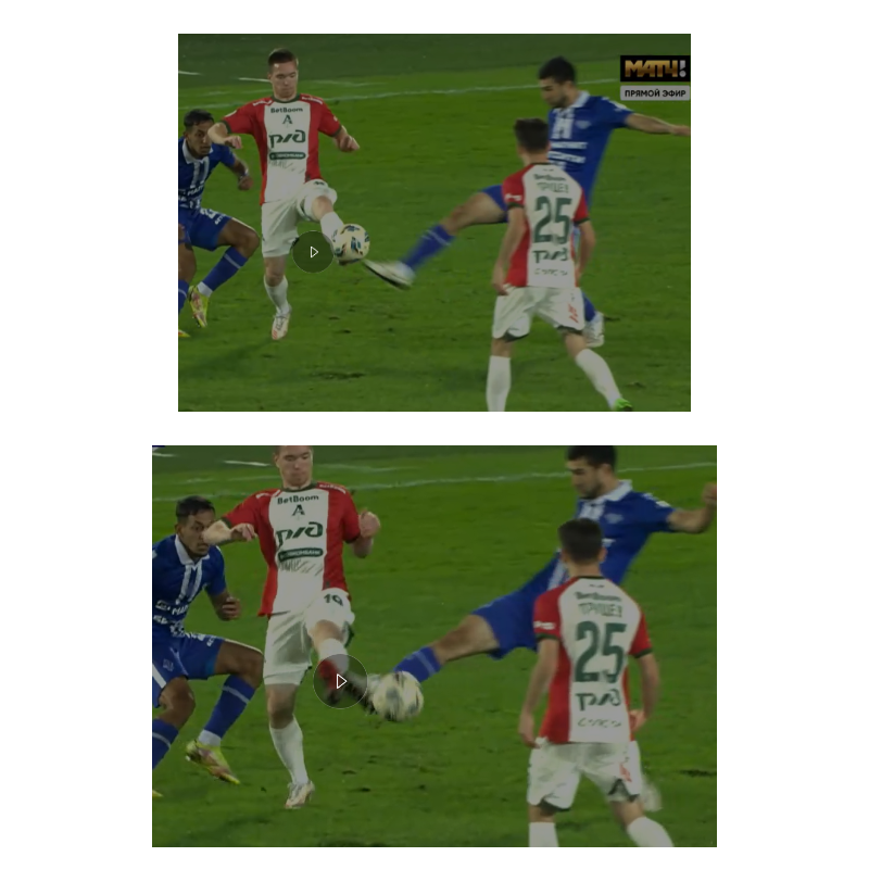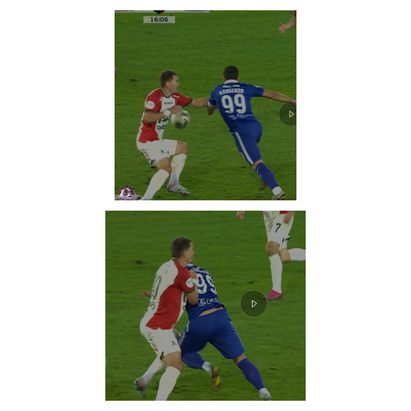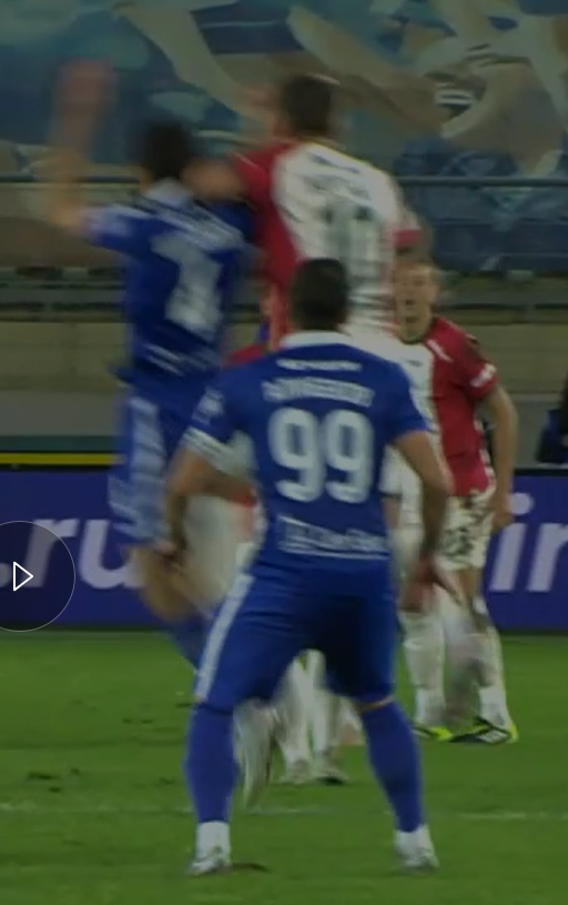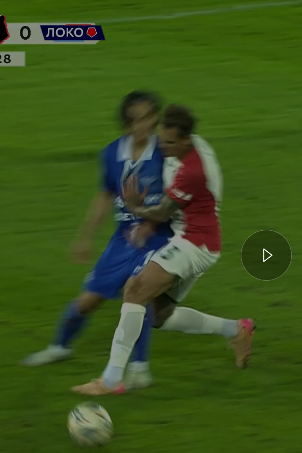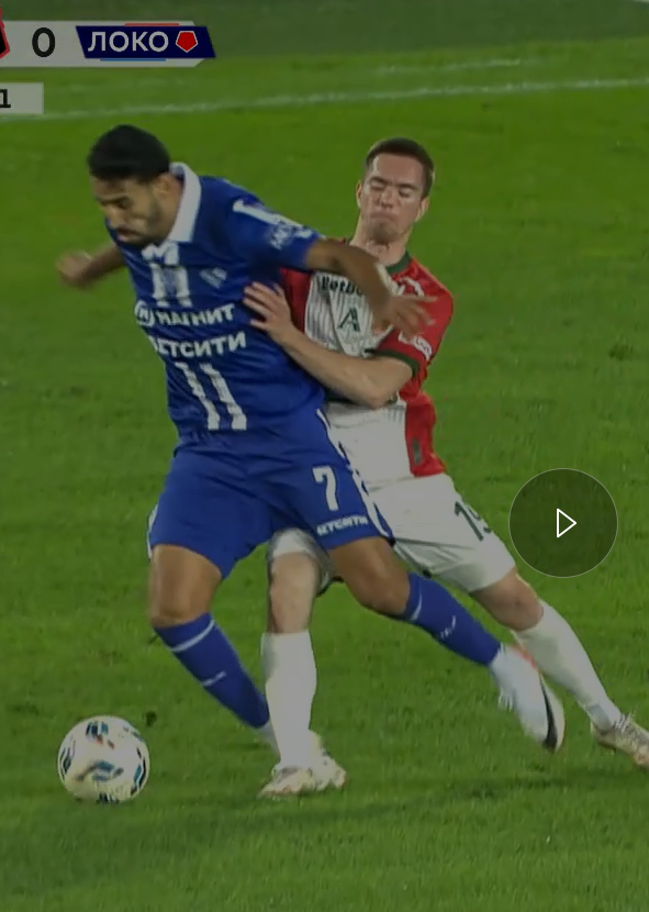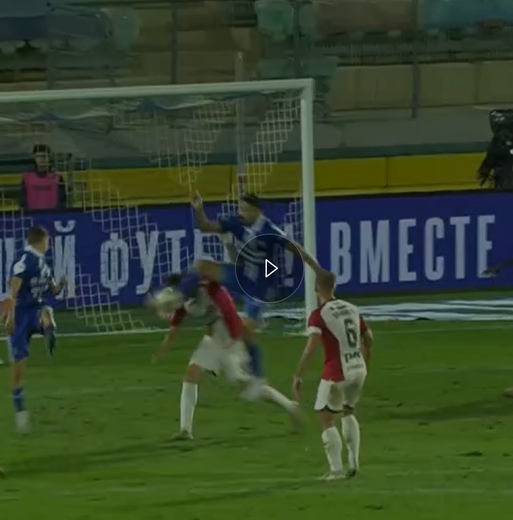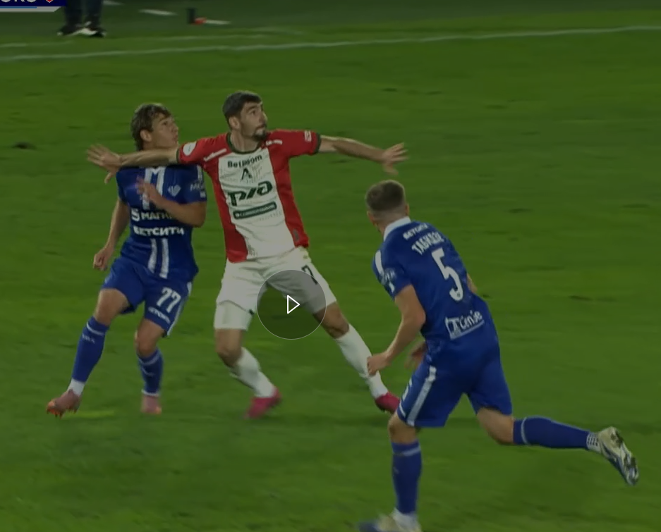 100 минута. Защитник сзади. Комличенко изображает. Может и подтолкнул, но Казарцев не верит. Минусы частых симуляций.