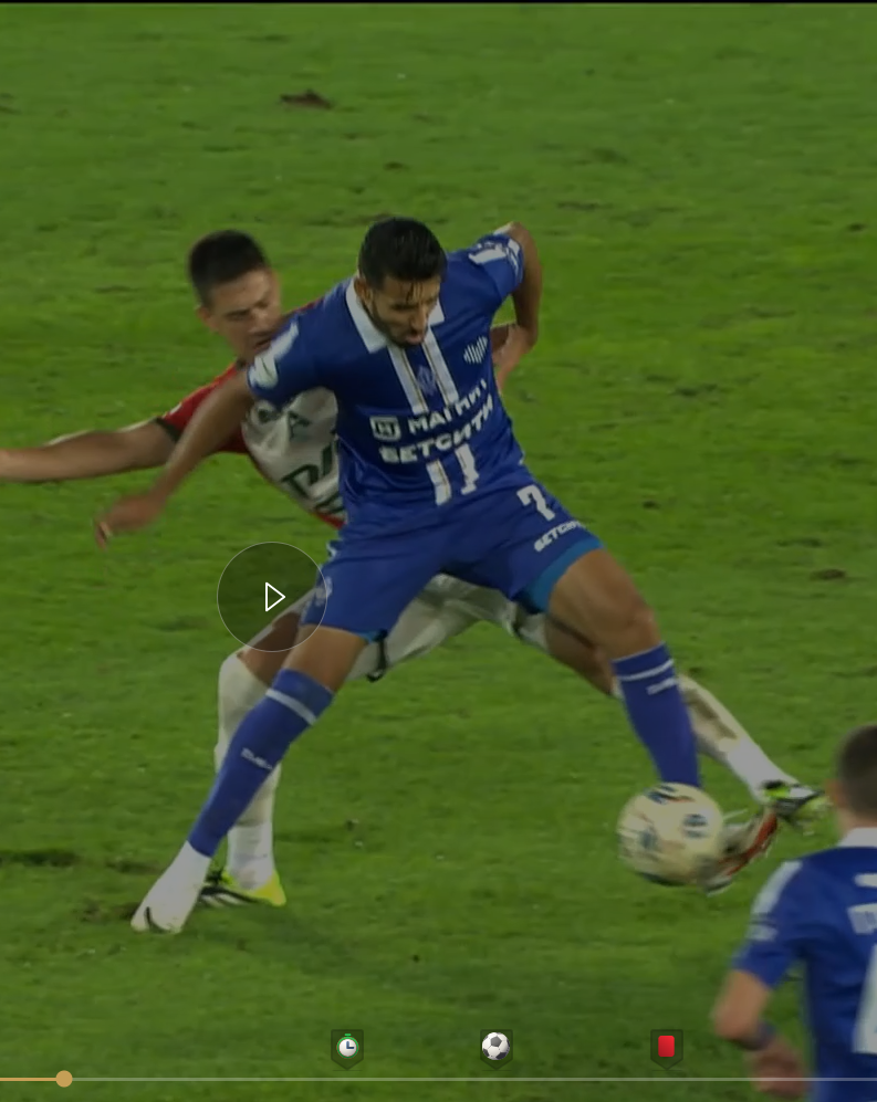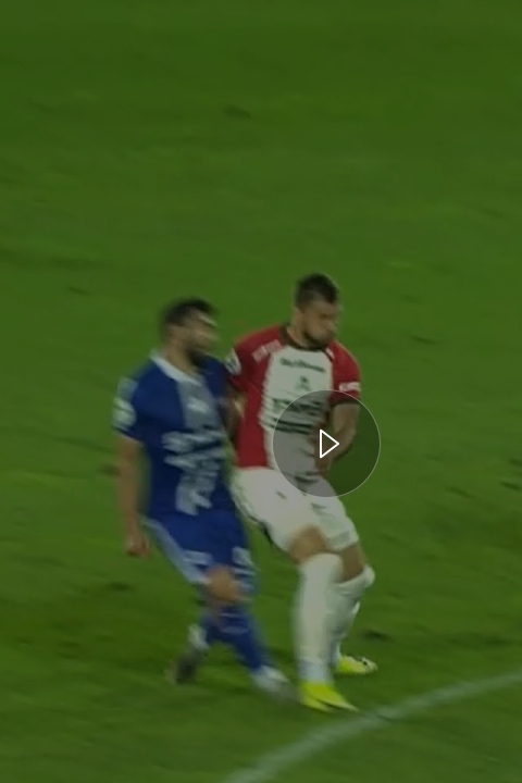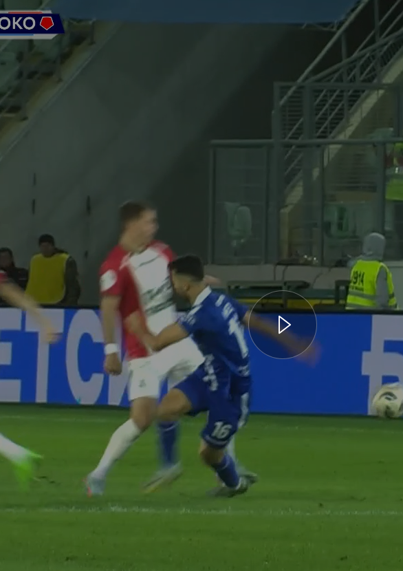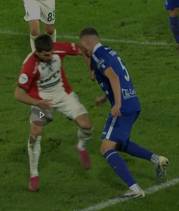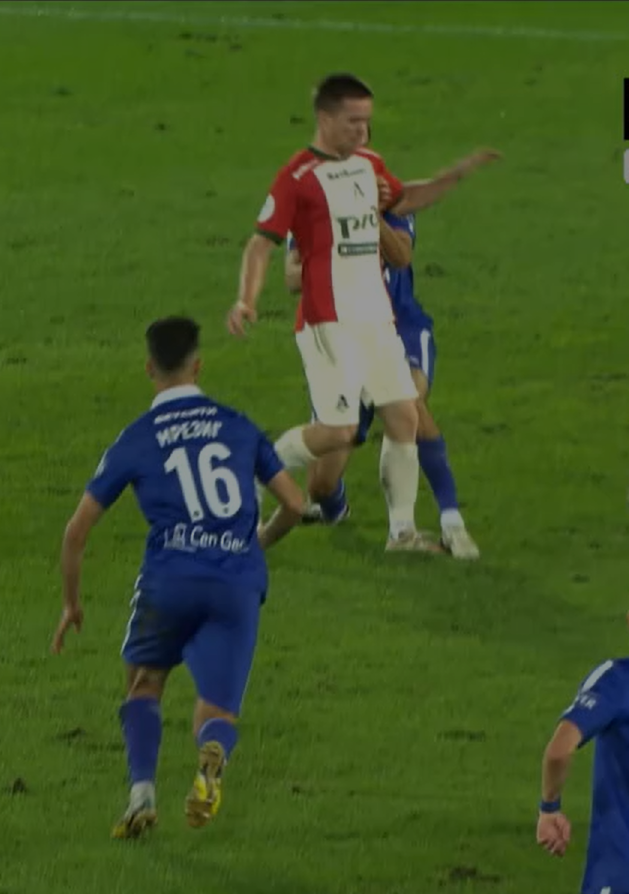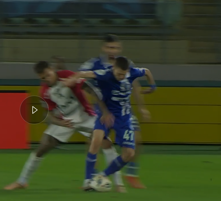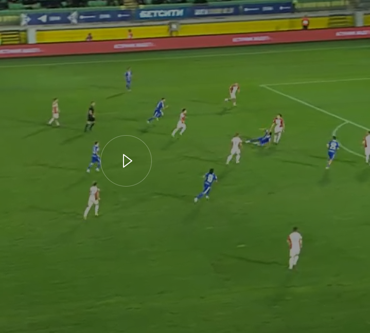 100 минута. Защитник сзади. Комличенко изображает. Может и подтолкнул, но Казарцев не верит. Минусы частых симуляций.