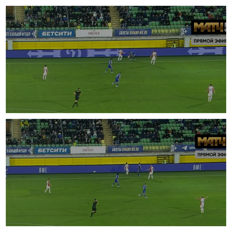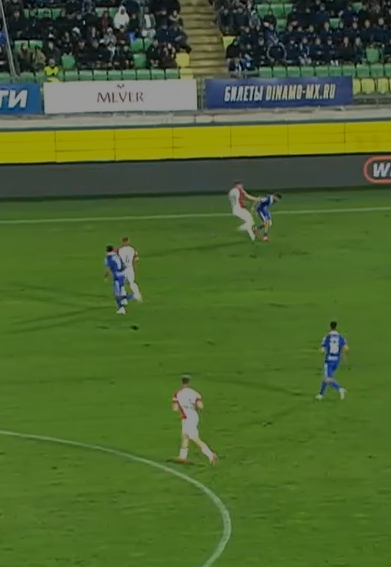 Не успевает Воробьёв сыграть в мяч и наступает на ногу Динамовцу. По идее - жёлтая карточка, но Казарцев фол не фиксирует.