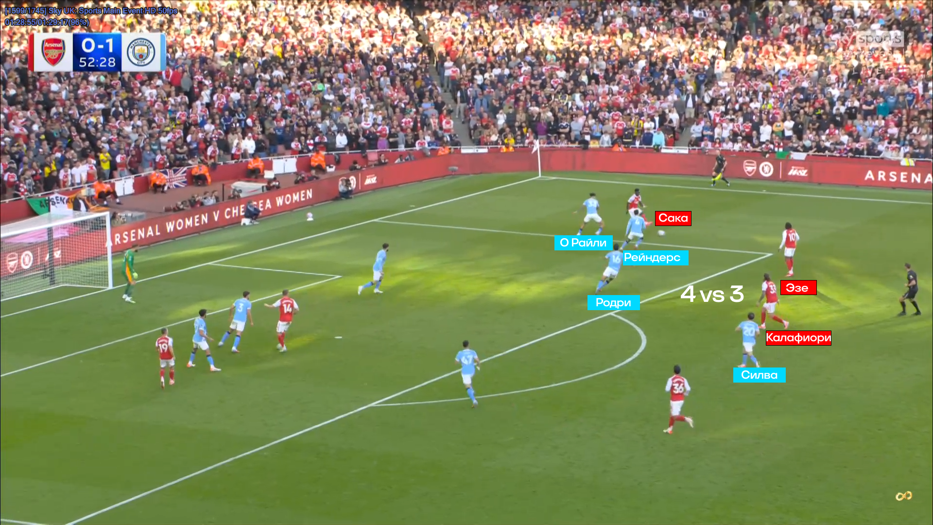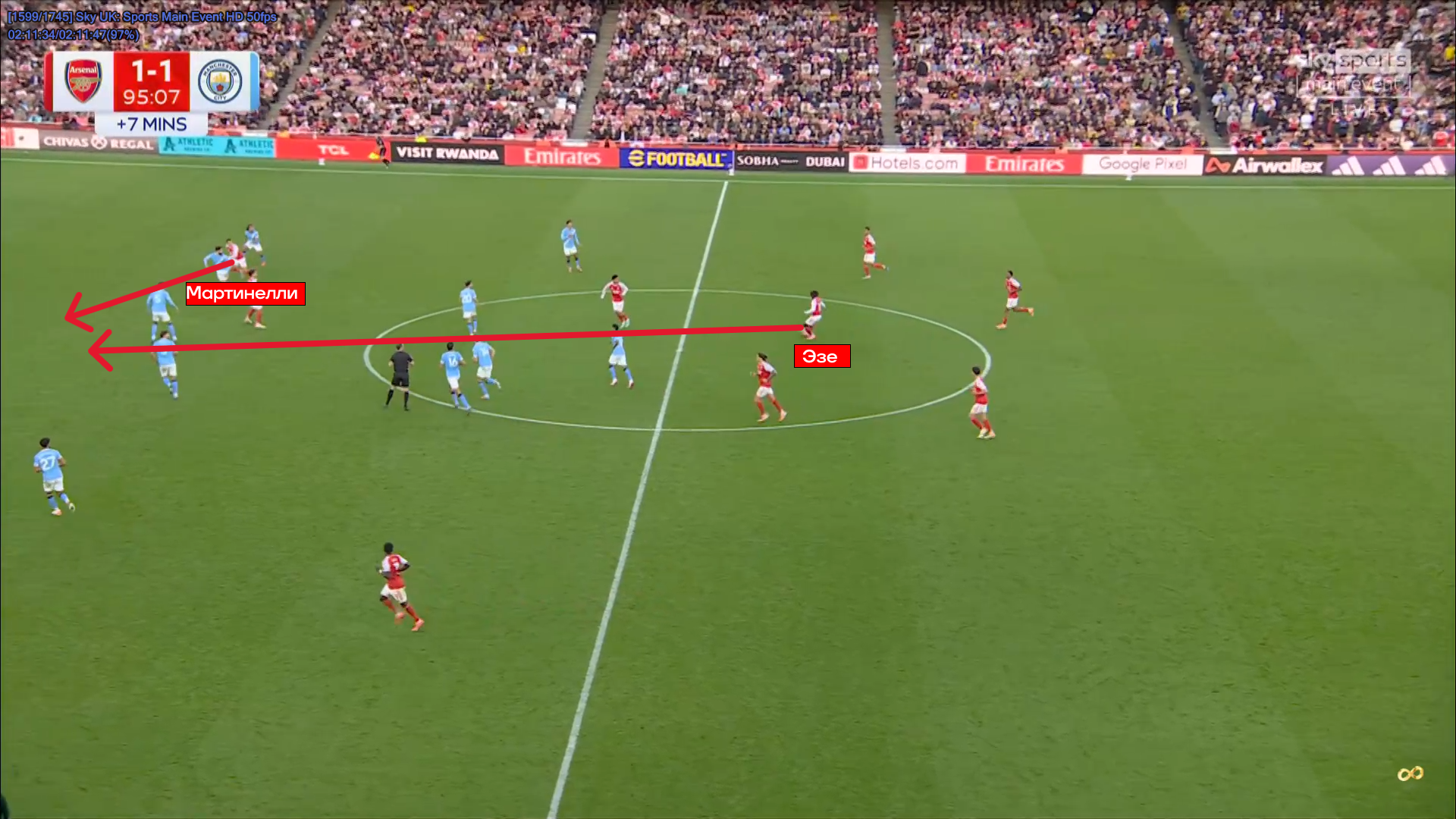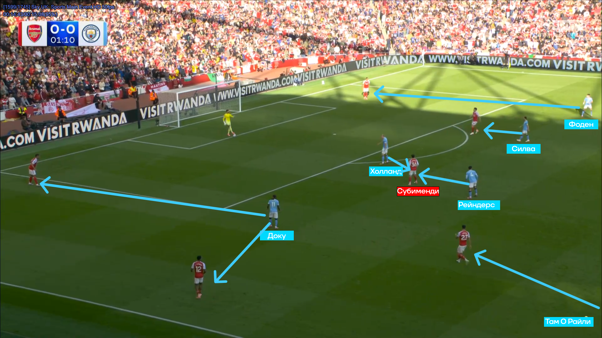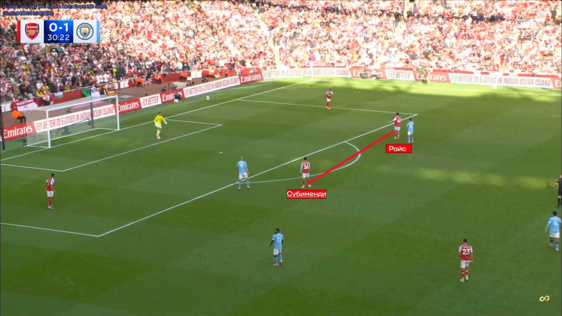 К середине тайма, когда прессинг «горожан» еще был достаточно активен, Артета стал опускать Деклана вместе с Субименди на свою треть поля, и это серьезно помогло «канонирам» в концовке тайма.