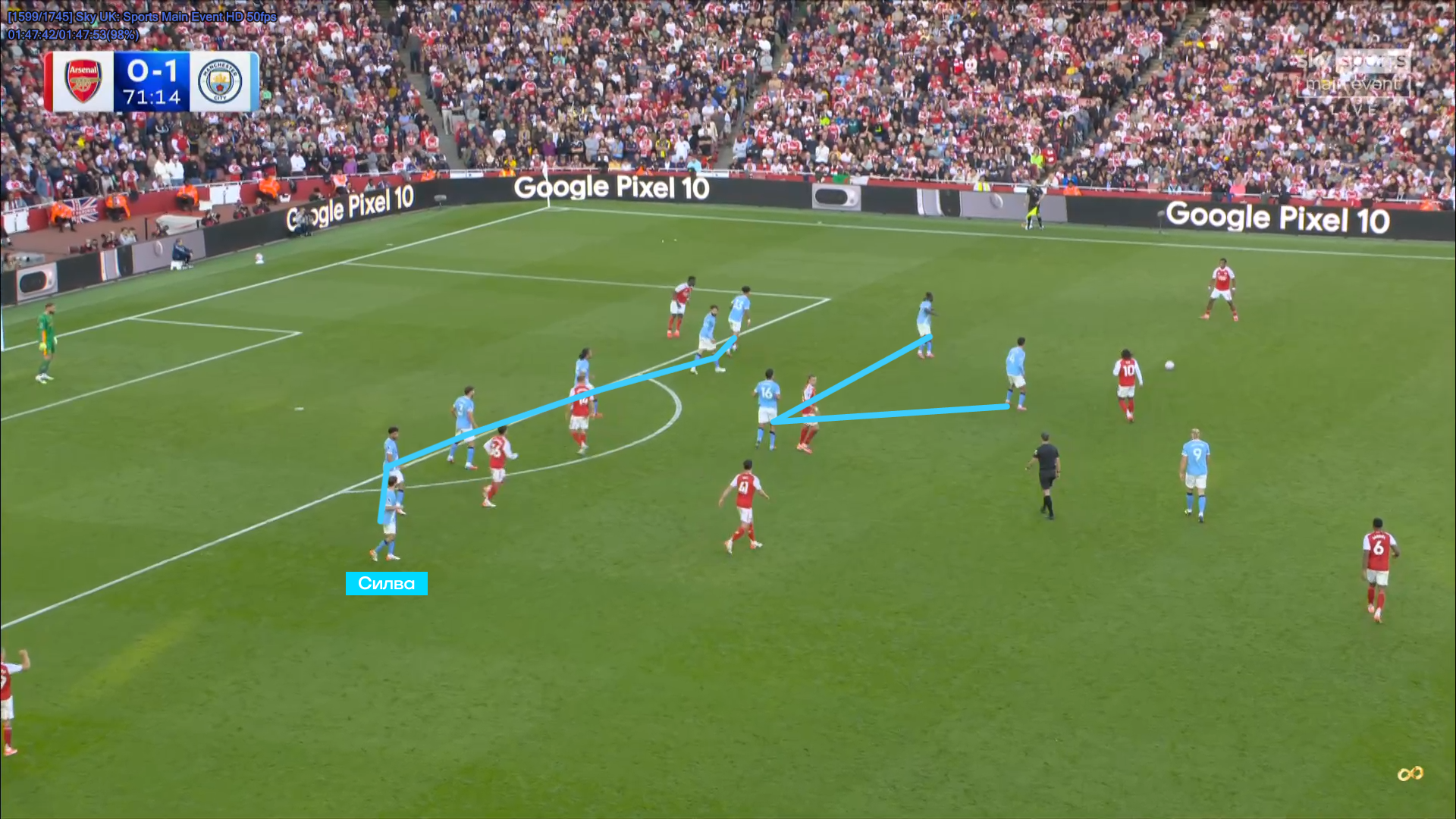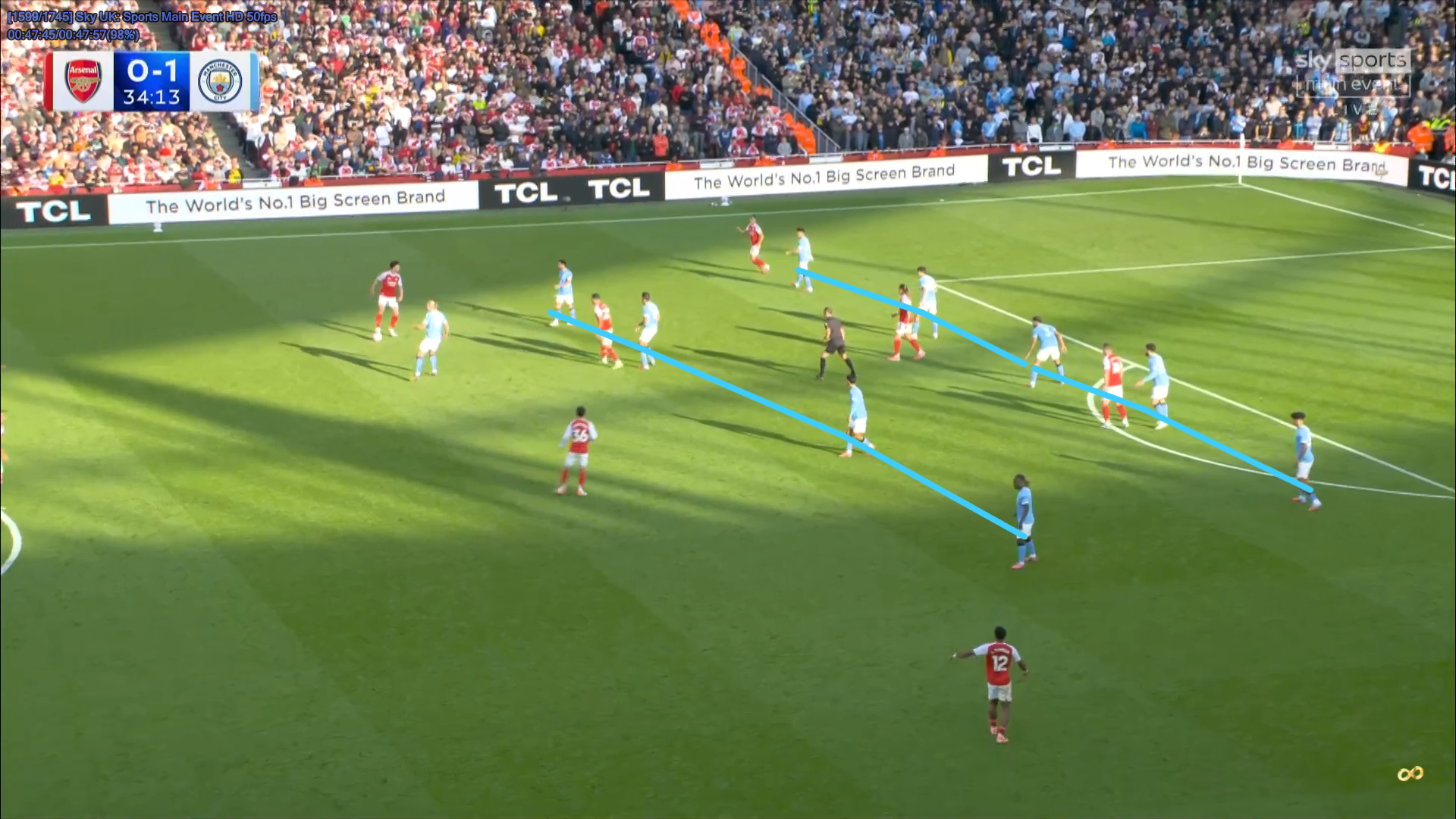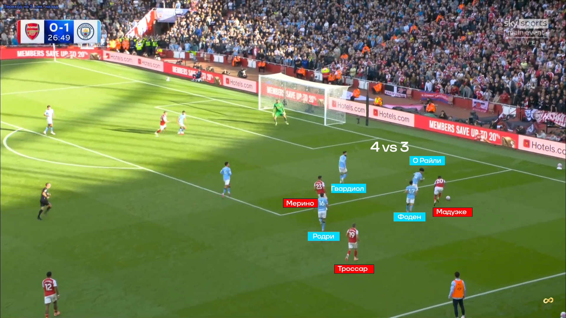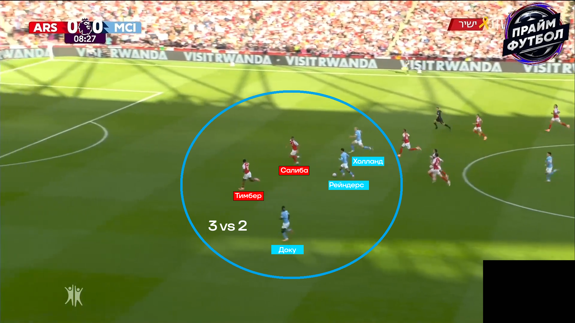 К середине тайма, когда прессинг «горожан» еще был достаточно активен, Артета стал опускать Деклана вместе с Субименди на свою треть поля, и это серьезно помогло «канонирам» в концовке тайма.