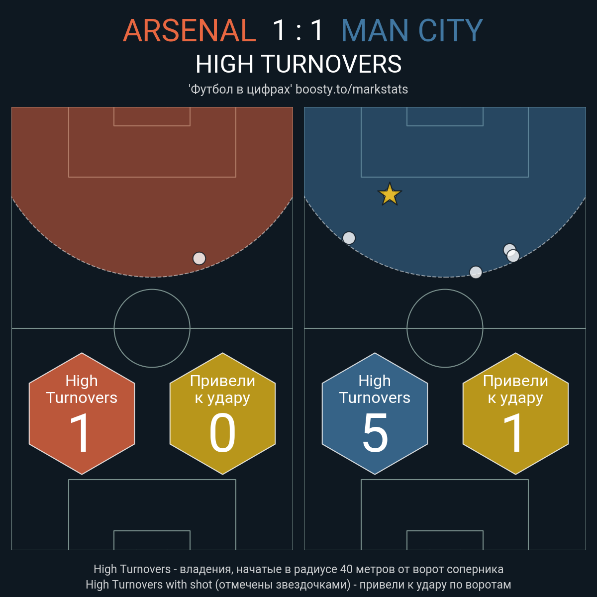 Даже после гола «Арсенал» продолжал настаивать на такой же агрессивной формации, которая в хорошем свете так и не проявила себя. Прессинг «канониров» ничего не смог поделать с вертикализированным «Сити», что подтверждает и статистка: у хозяев лишь 1 высокий возврат мяча за 90 минут. В 5 раз меньше, чем у соперника.