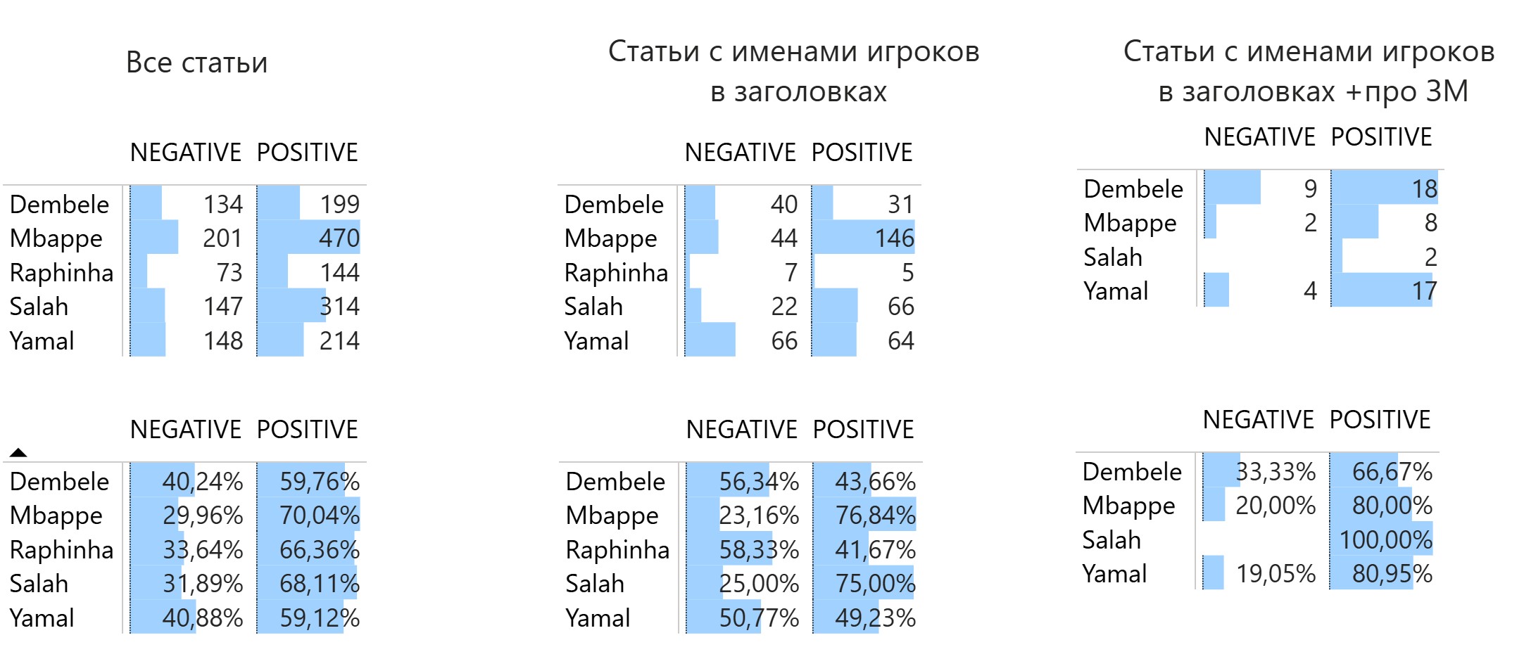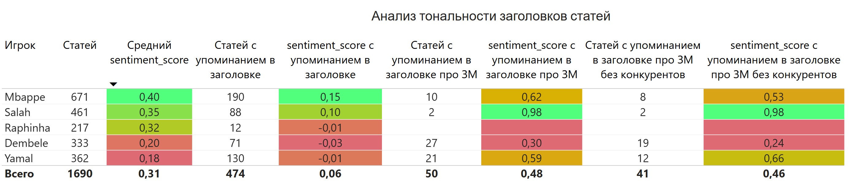 Если смотреть только заголовки, в которых упоминают игрока, то позитива уже меньше, но лидер также – Мбаппе (0.15 балла), второй – Салах (0.10). У Рафиньи (-0.01) и Ямаля (-0.01) в среднем нейтральные заголовки, а у Дембеле (-0.03) – слабонегативные.