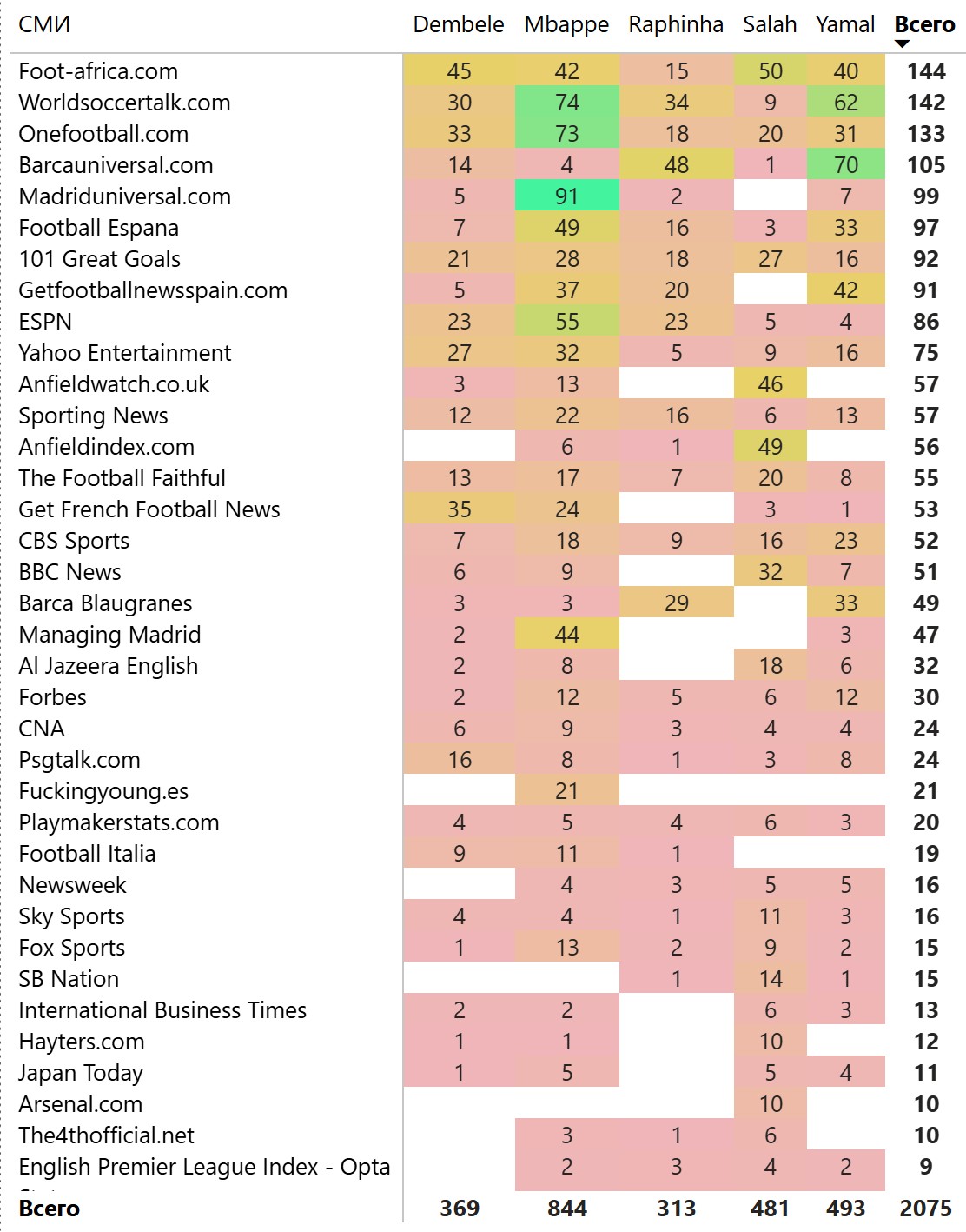 СМИ «Барселоны» и «Реала» активно продвигают своих кандидатов и практически не упоминают конкурентов, у «Барселоны» видимо большая ставка на Ямаля, у «Реала» на Мбаппе. Данные этих СМИ мы не учитываем в статье (давали почти 20% от общего количества статей с упоминаниями игроков).